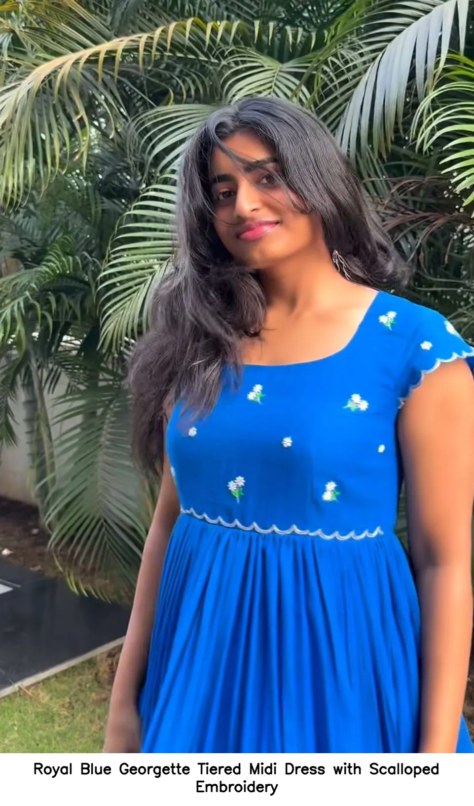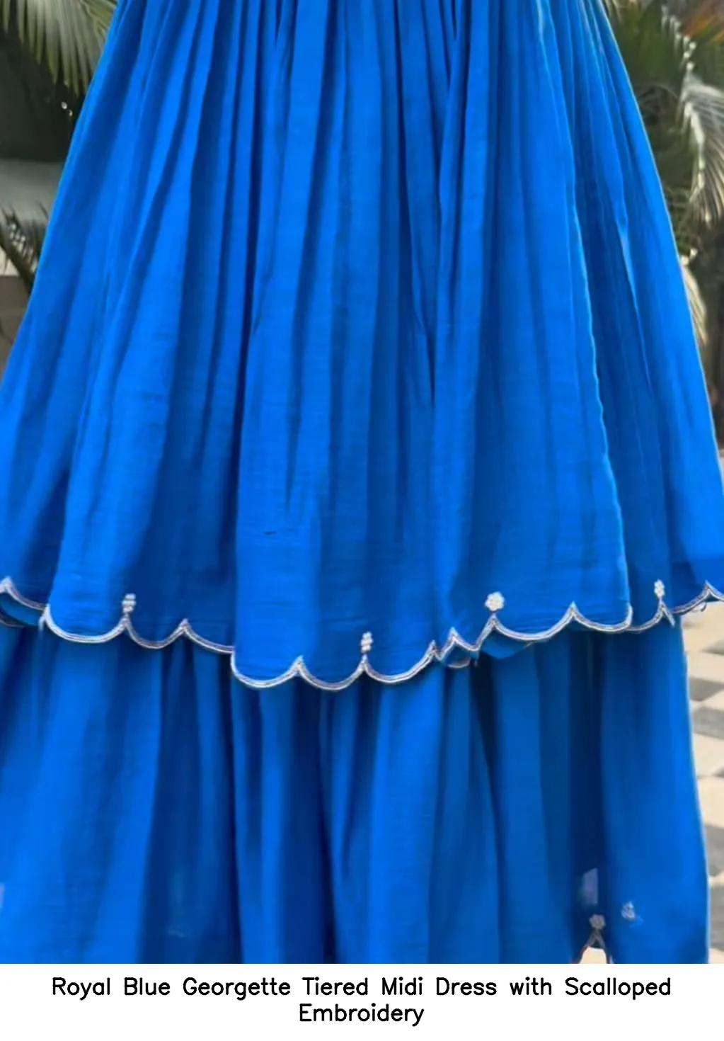 Features of the Royal Blue Georgette Tiered Midi Dress with Scalloped Embroidery