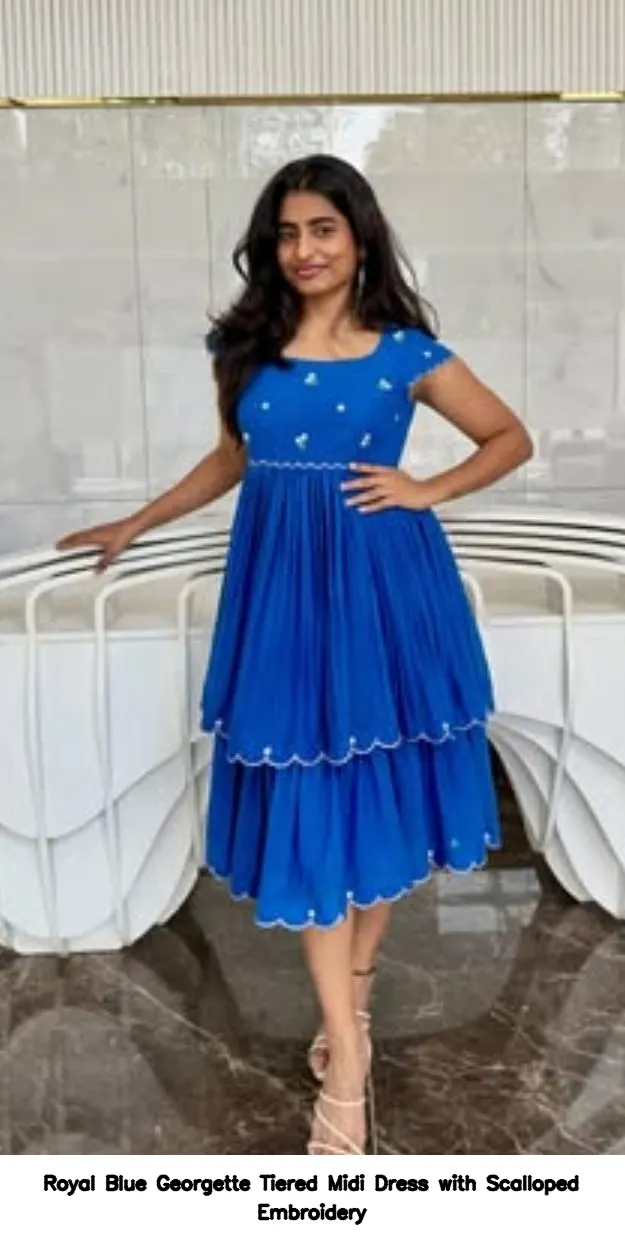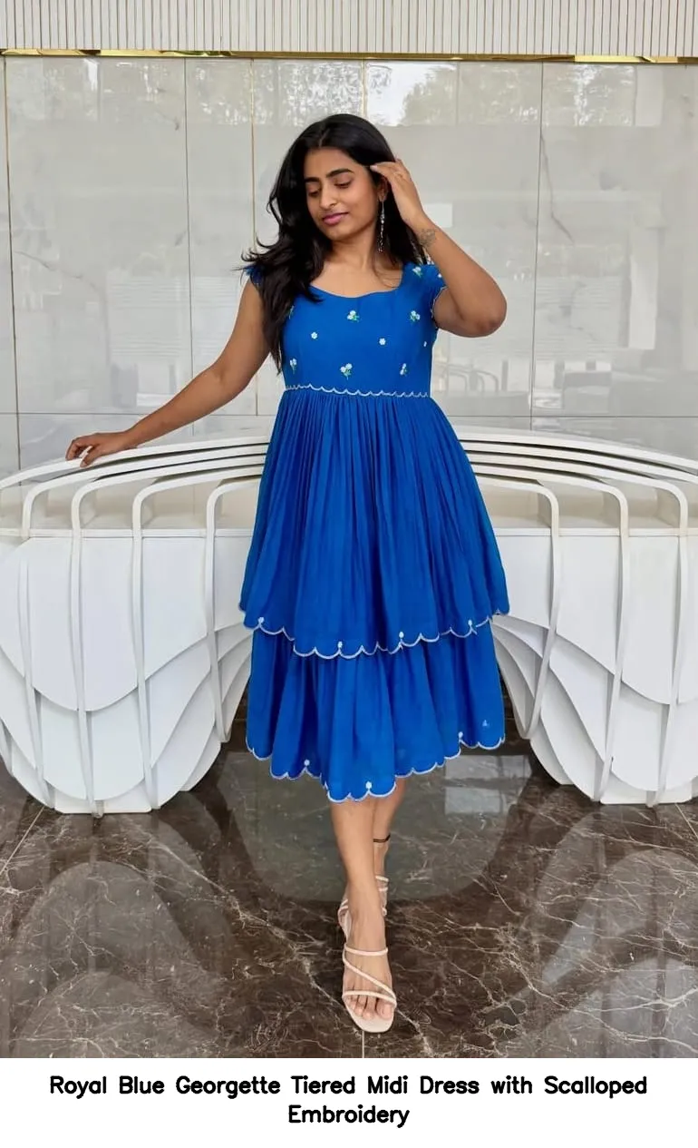This exquisite dress comes in sizes XL, XXL, and 3XL. Priced at just 5500 INR, the Royal Blue Georgette Tiered Midi Dress with Scalloped Embroidery offers great value for luxury fashion.
