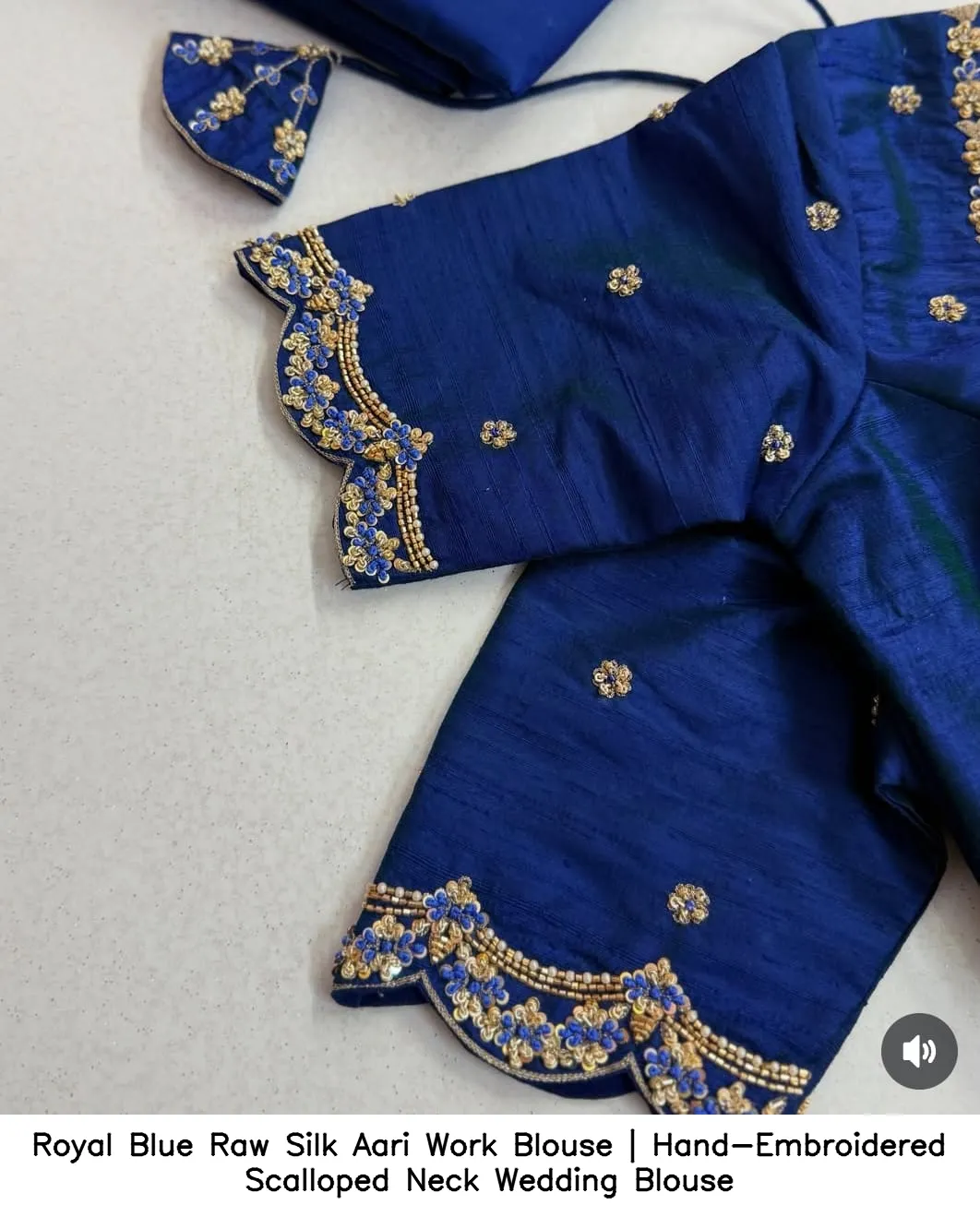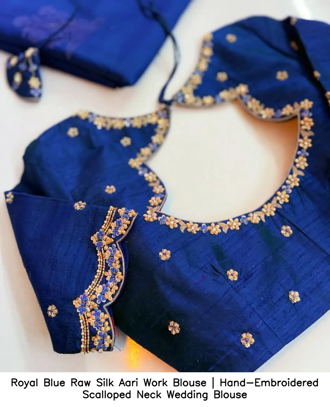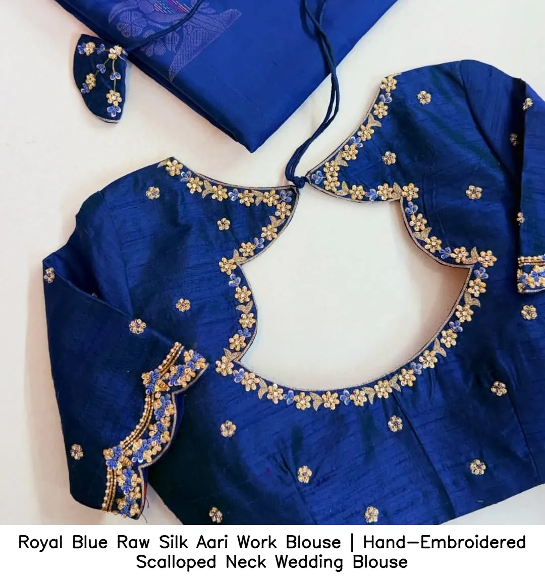 Royal Blue Raw Silk Aari Work Blouse | Hand-Embroidered Scalloped Neck Wedding Blouse