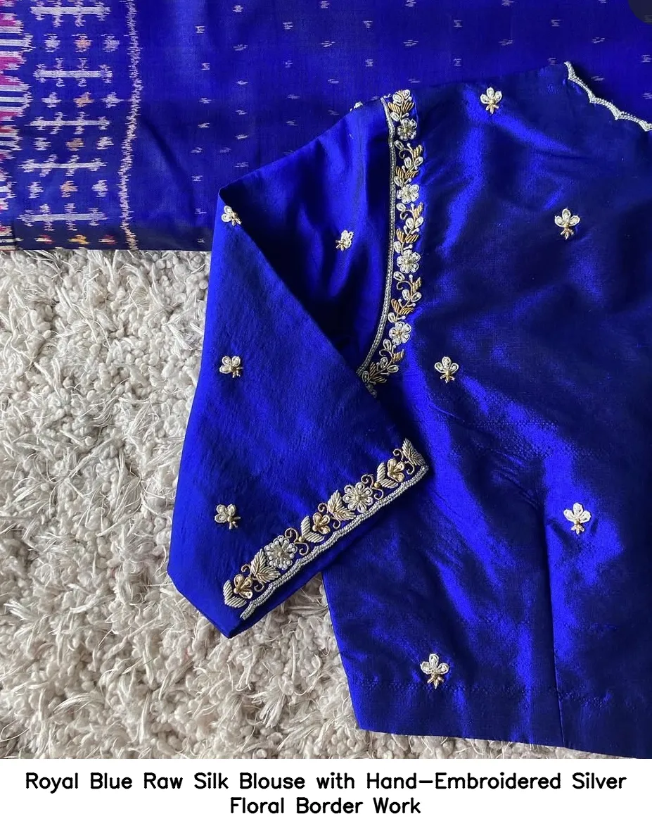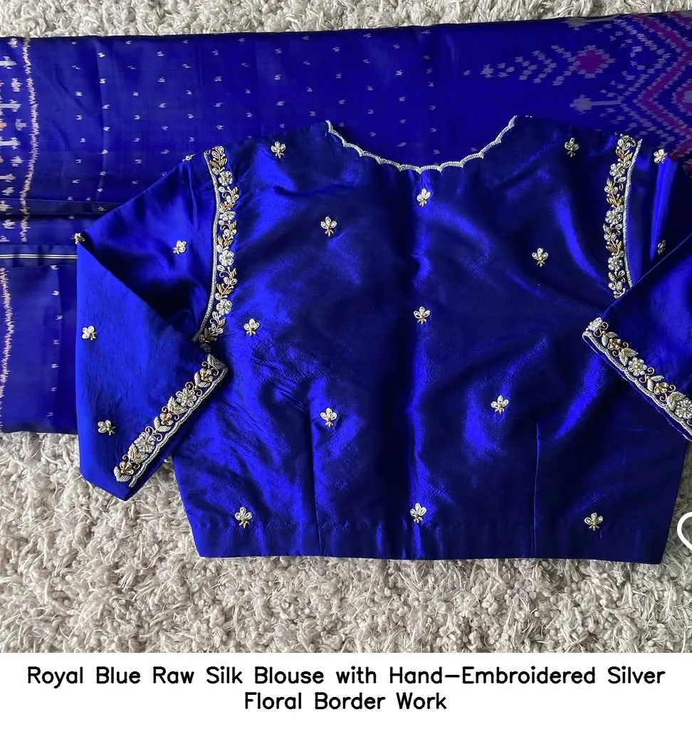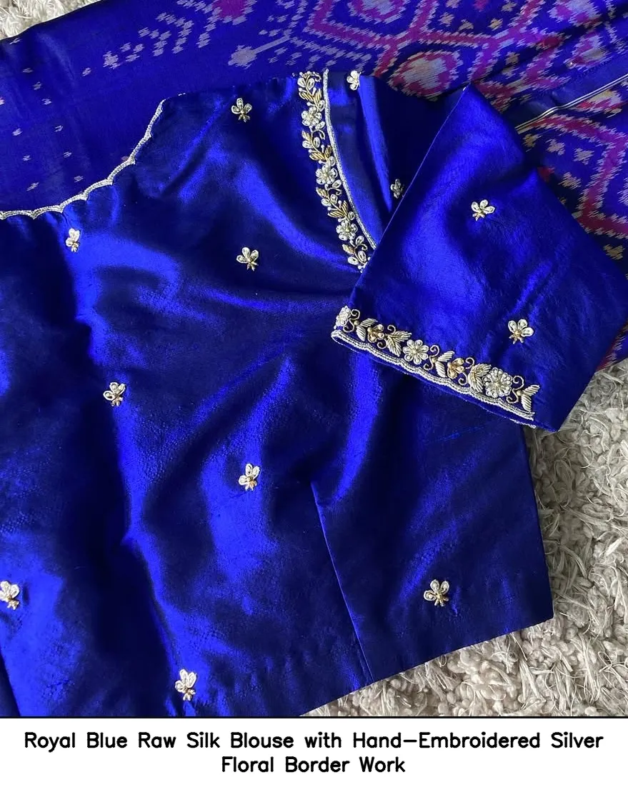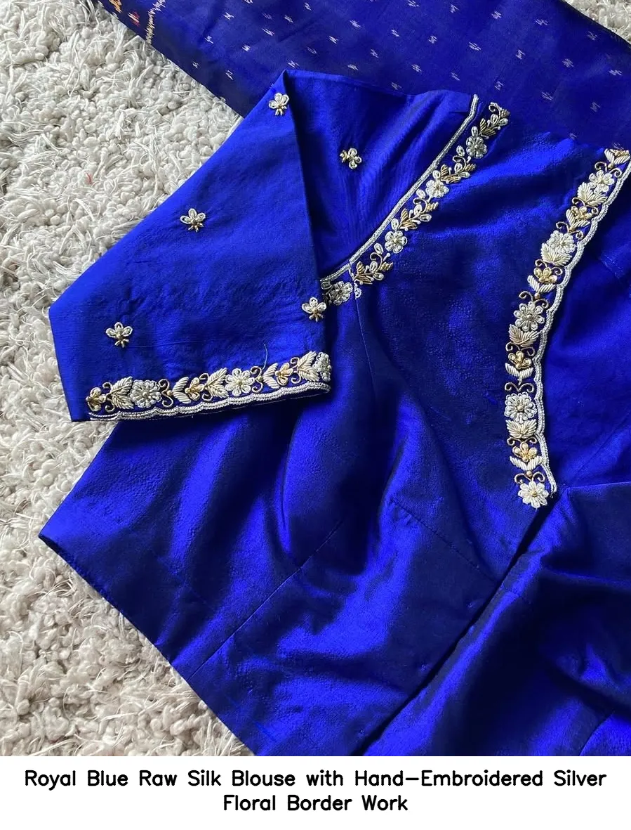 Introducing the exquisite Royal Blue Raw Silk Blouse with Hand-Embroidered Silver Floral Border Work. This stunning blouse is crafted from premium raw silk, offering both elegance and comfort. The hand-embroidered silver floral border adds a touch of sophistication, making it perfect for various occasions.