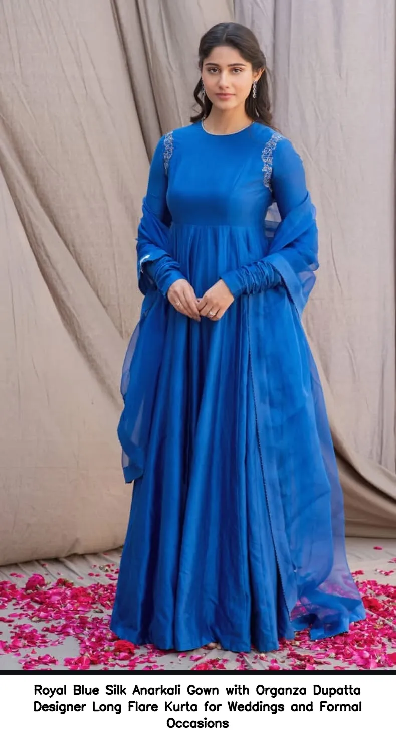 Product Name: Royal Blue Silk Anarkali Gown with Organza Dupatta – Designer Long Flare Kurta for Weddings and Formal Occasions