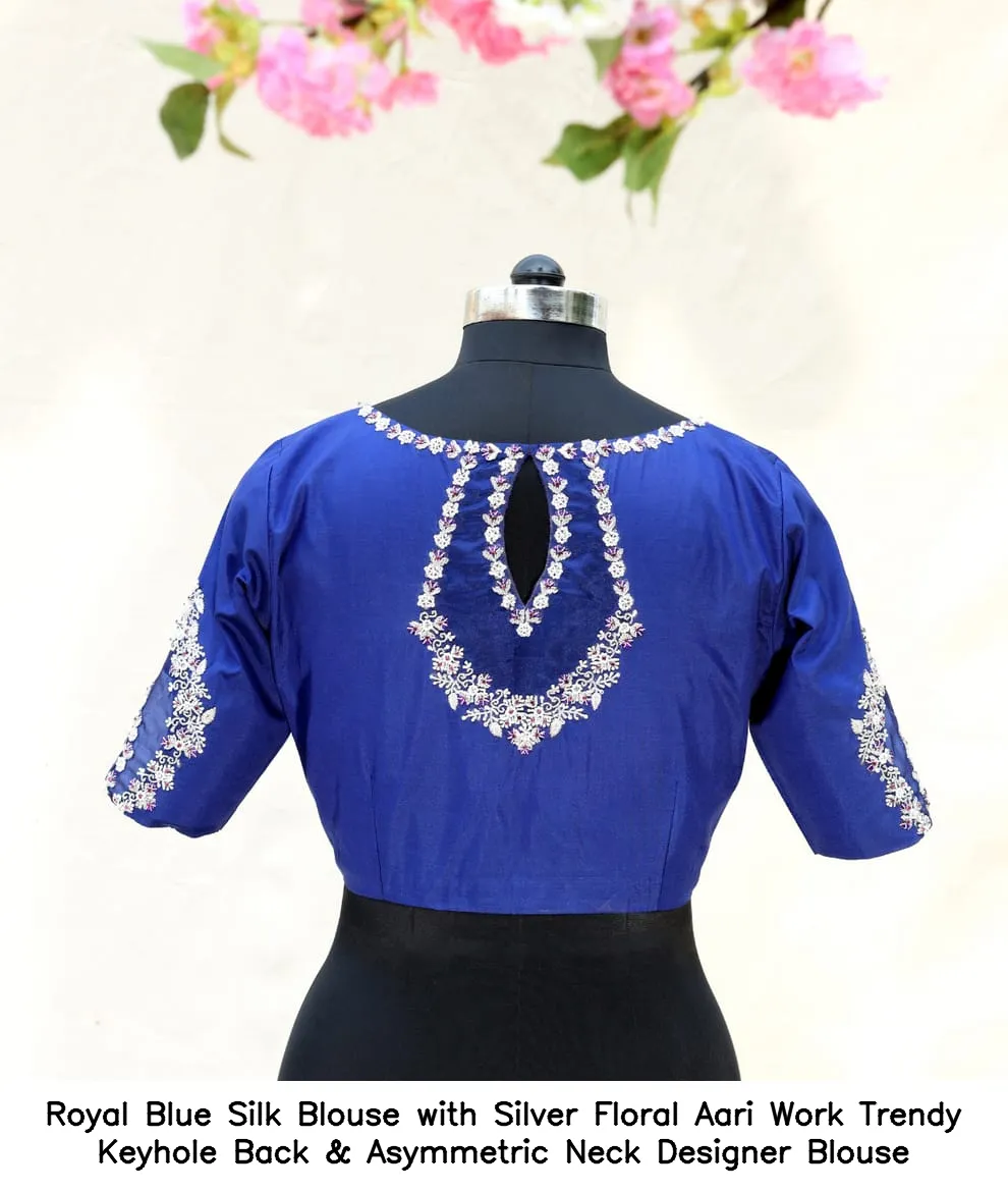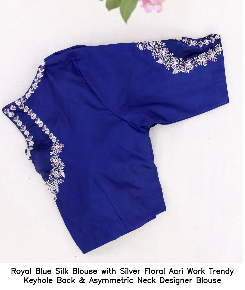 Royal Blue Silk Blouse with Silver Floral Aari Work – Trendy Keyhole Back & Asymmetric Neck Designer Blouse