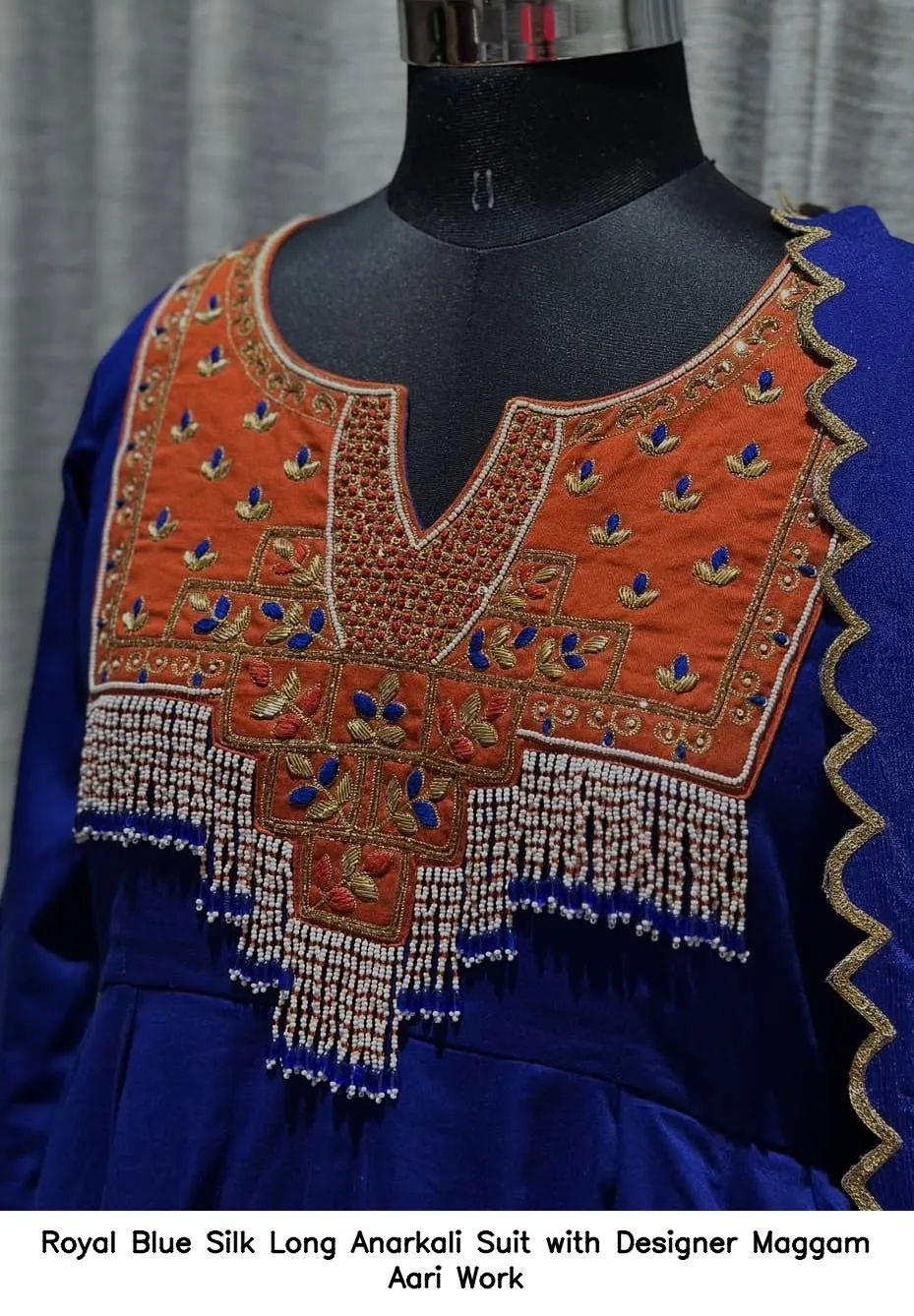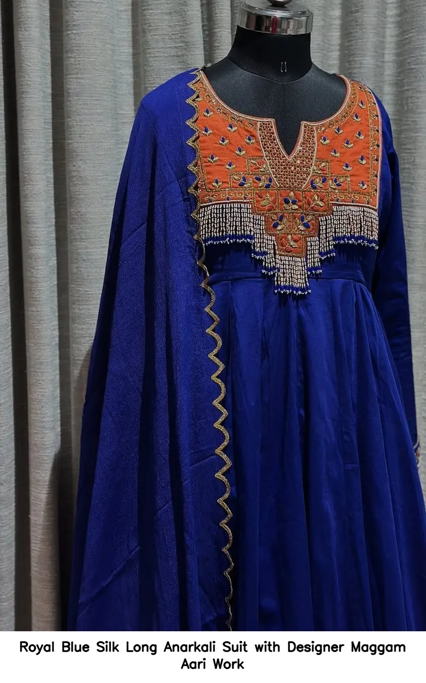 This Royal Blue Silk Long Anarkali Suit with Designer Maggam Aari Work is a must-have for your ethnic collection. We encourage you to follow us on Facebook for updates and new arrivals!