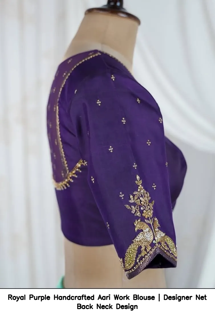 Royal Purple Handcrafted Aari Work Blouse | Designer Net Back Neck Design