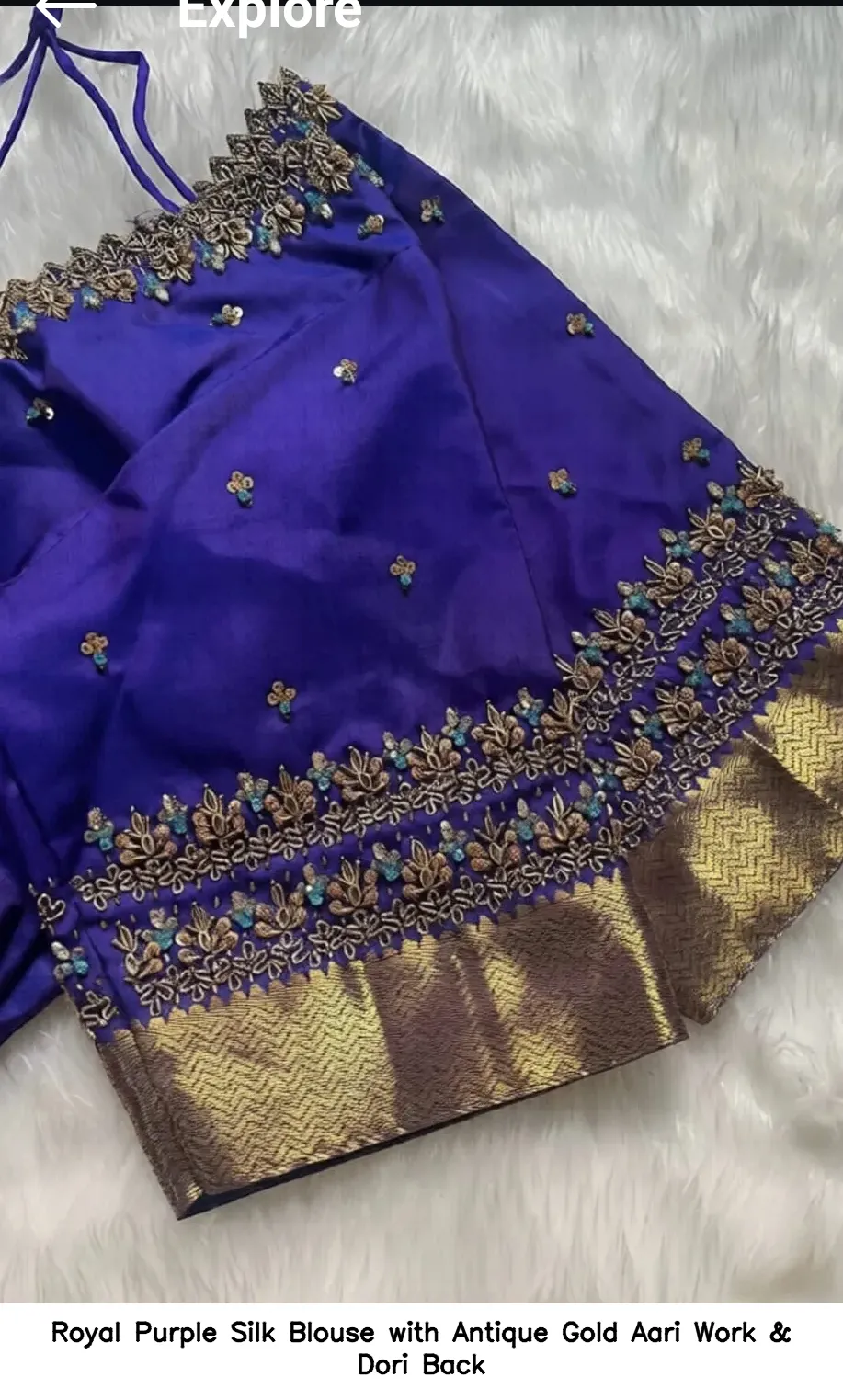 Product Name: ​​​​​Royal Purple Silk Blouse with Antique Gold Aari Work & Dori Back