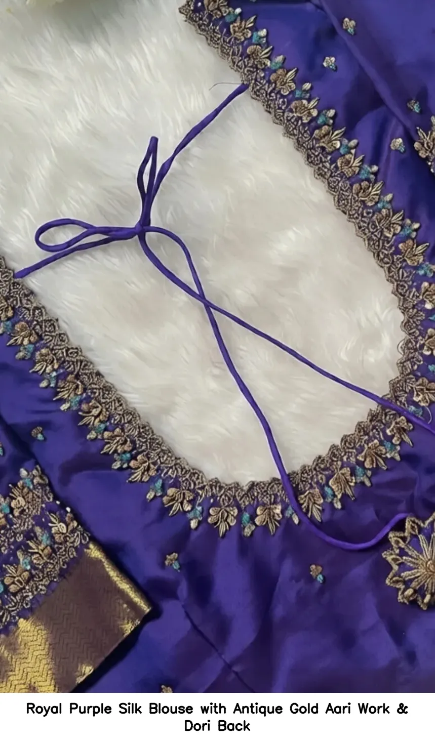 Royal Purple Silk Blouse with Antique Gold Aari Work & Dori Back