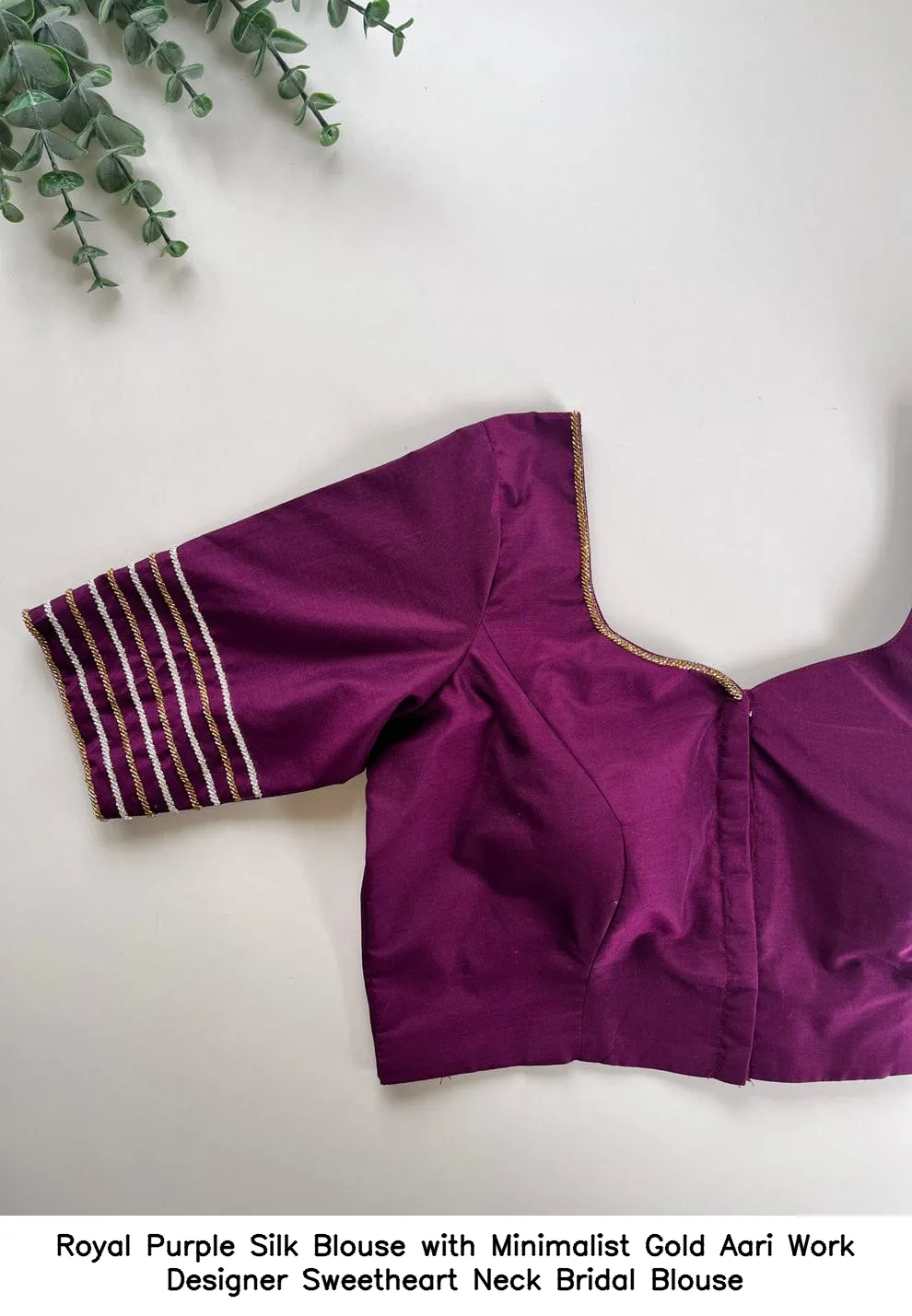 ​​​​Royal Purple Silk Blouse with Minimalist Gold Aari Work – Designer Sweetheart Neck Bridal Blouse