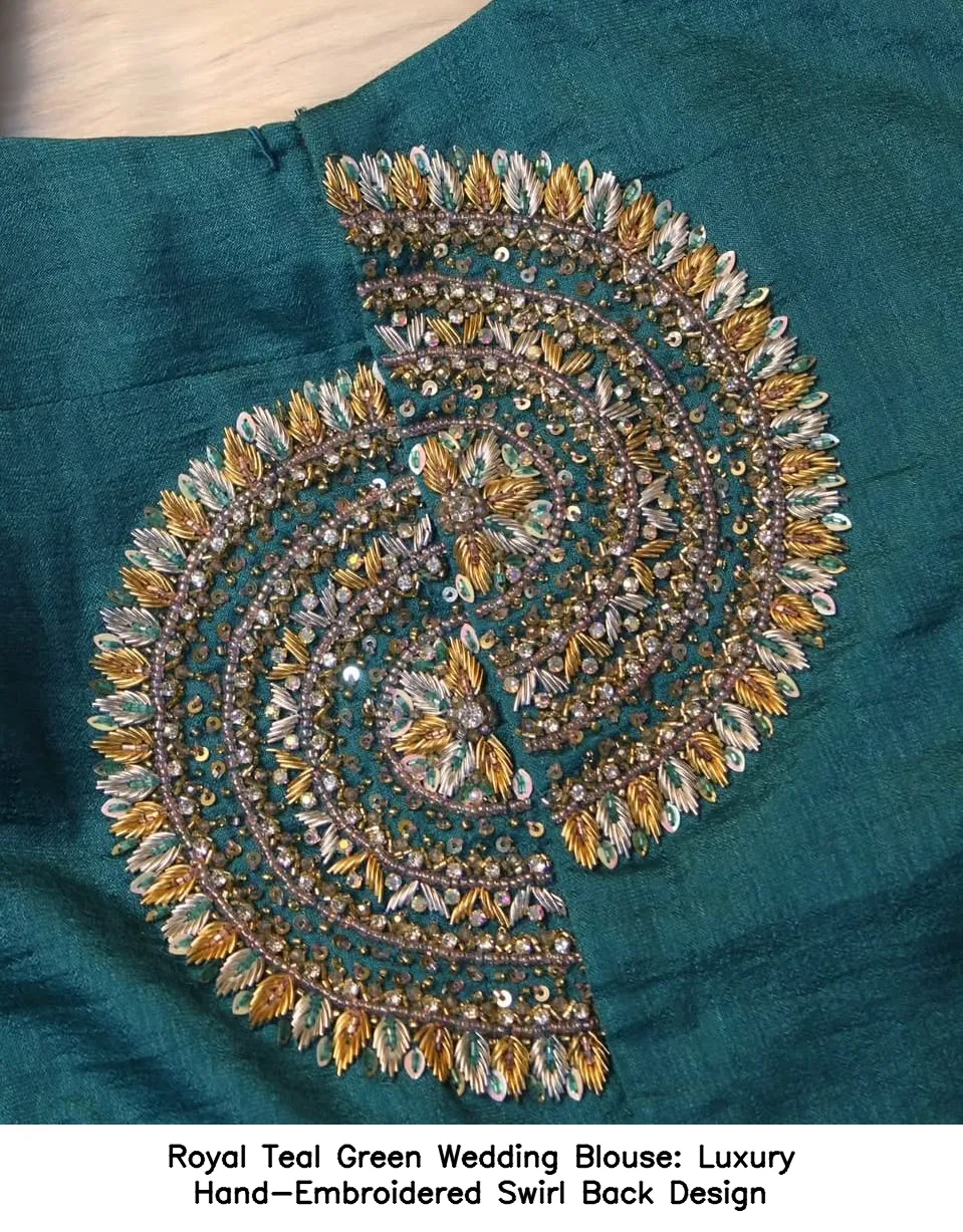 Royal Teal Green Wedding Blouse: Luxury Hand-Embroidered Swirl Back Design