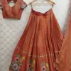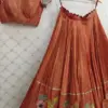 Product Name: ​Rust Brown Hand-Painted Pure Tissue Lehenga with Heavy Maggam Work | Customized Ethnic Wear
