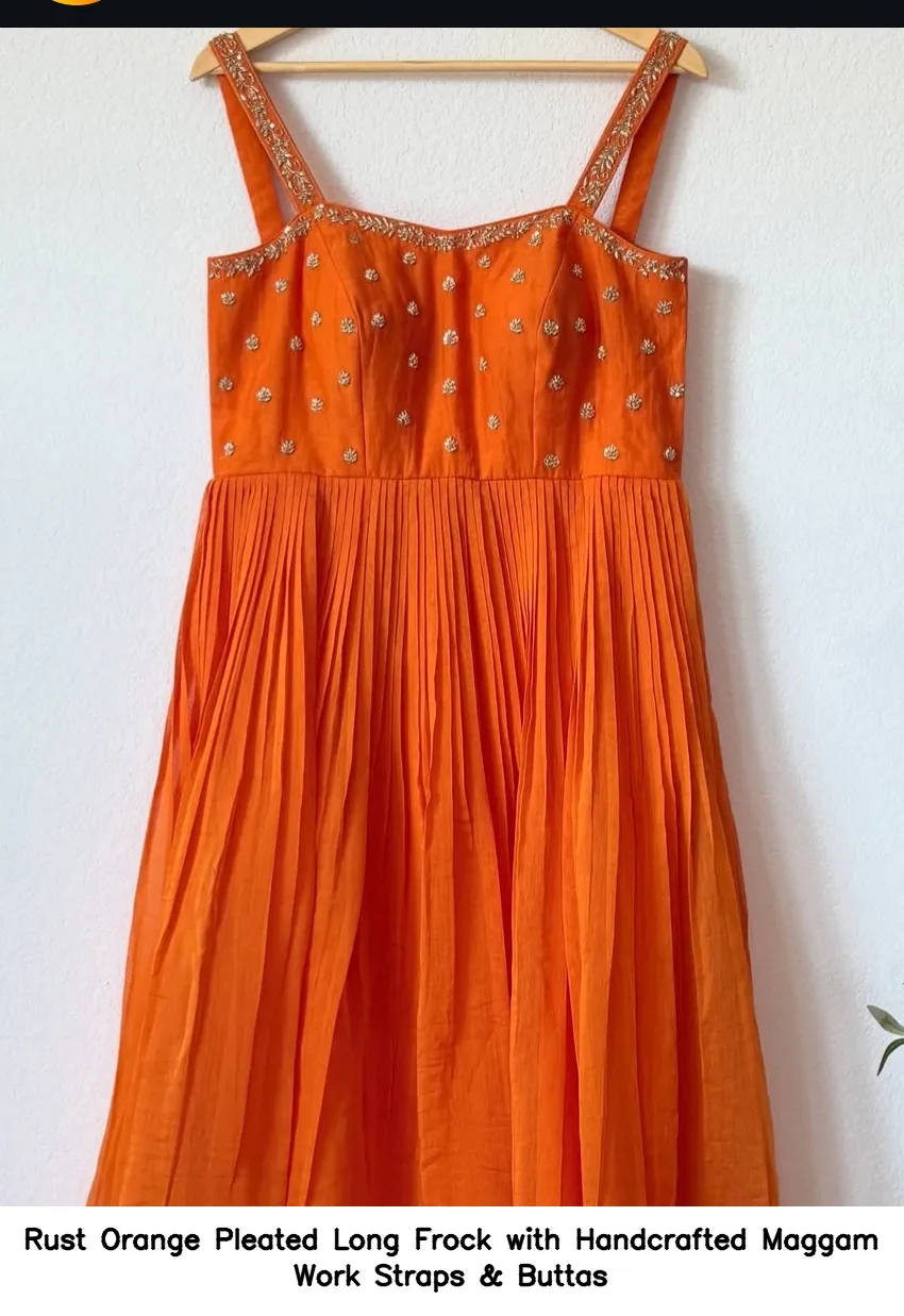 Rust Orange Pleated Long Frock with Handcrafted Maggam Work Straps & Buttas