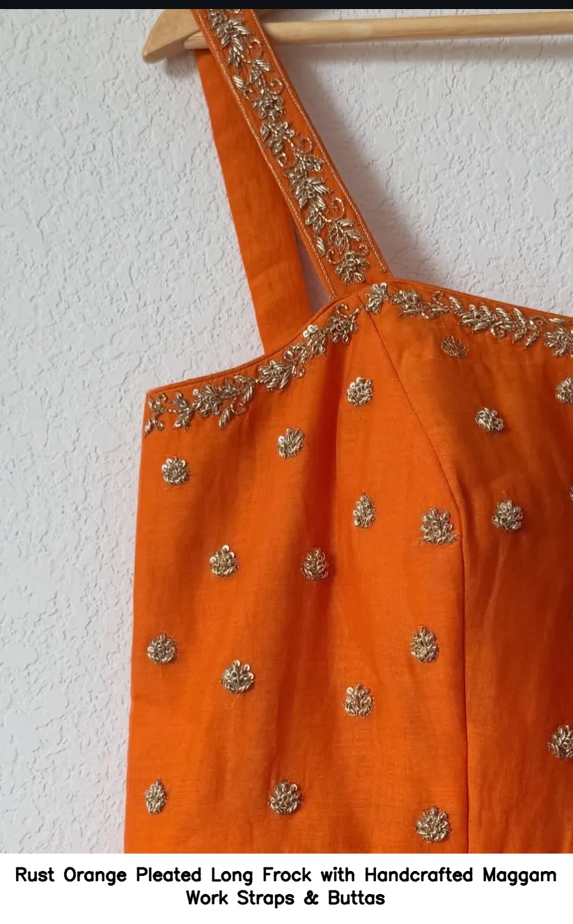 To maintain the beauty of your Rust Orange Pleated Long Frock with Handcrafted Maggam Work Straps & Buttas, we recommend gentle hand washing in cold water. Avoid harsh detergents and direct sunlight to keep the color vibrant.
