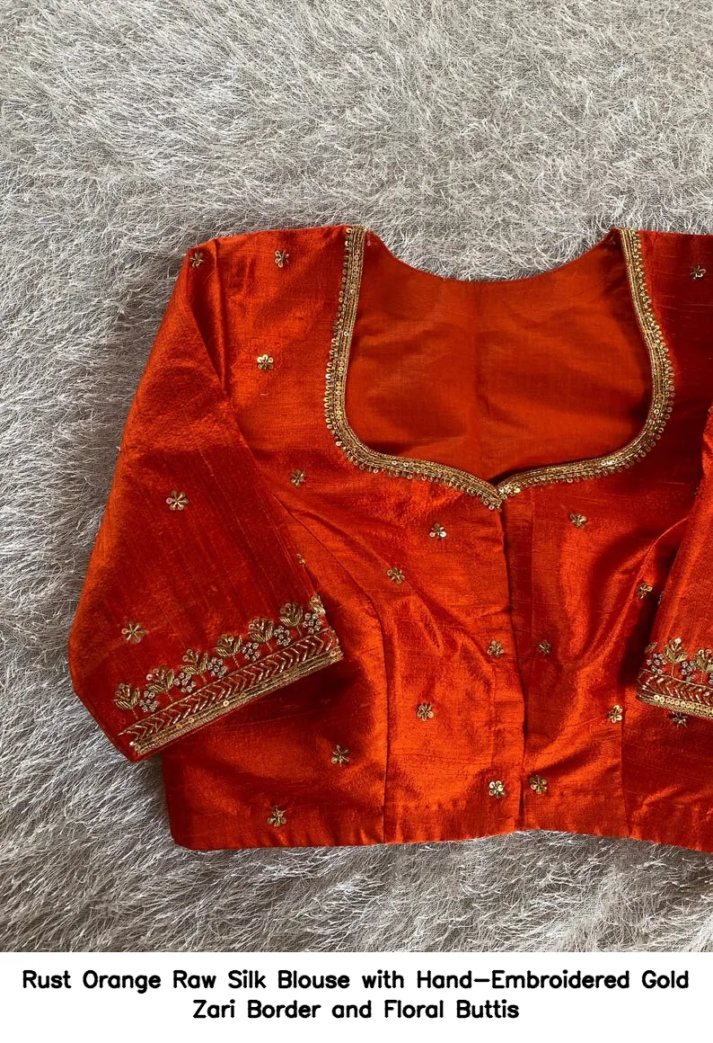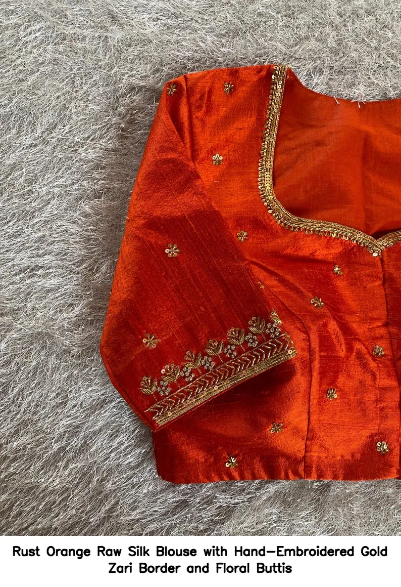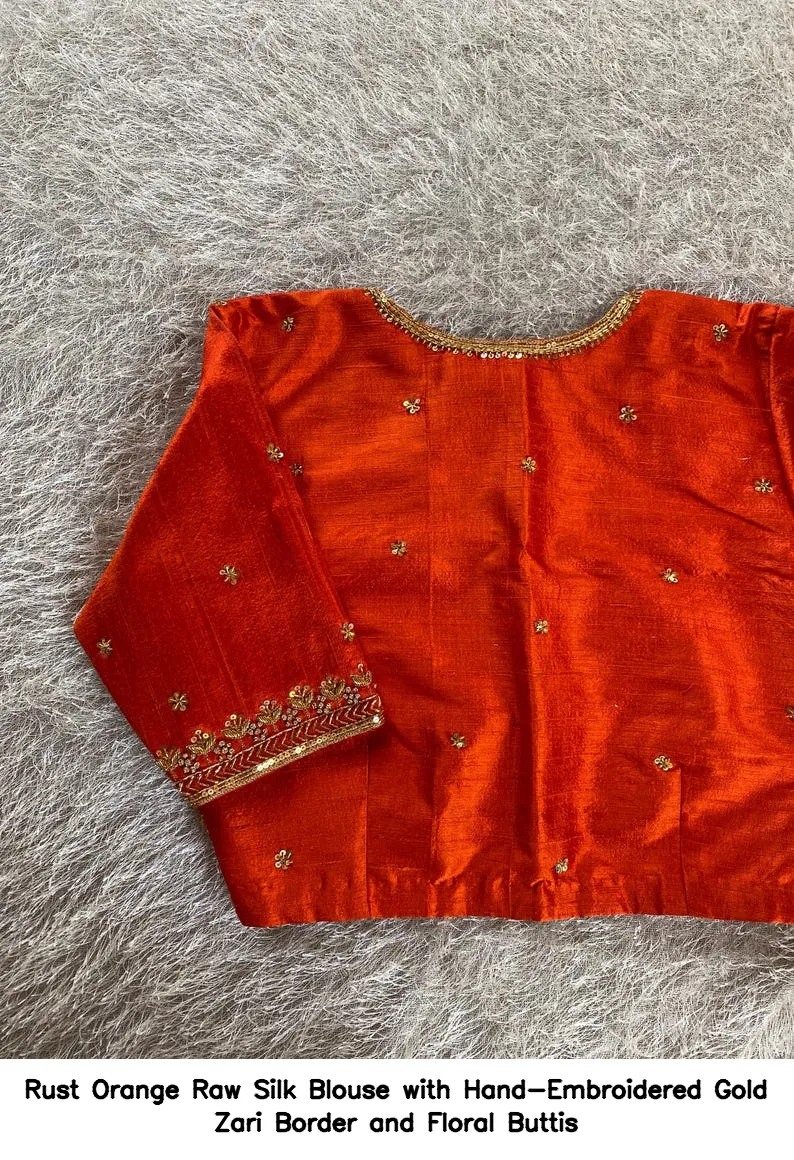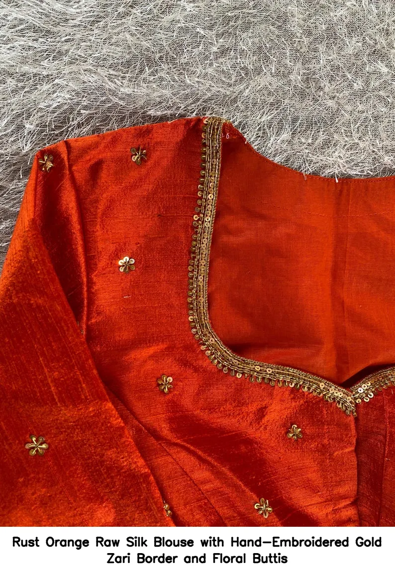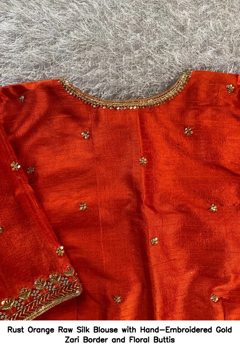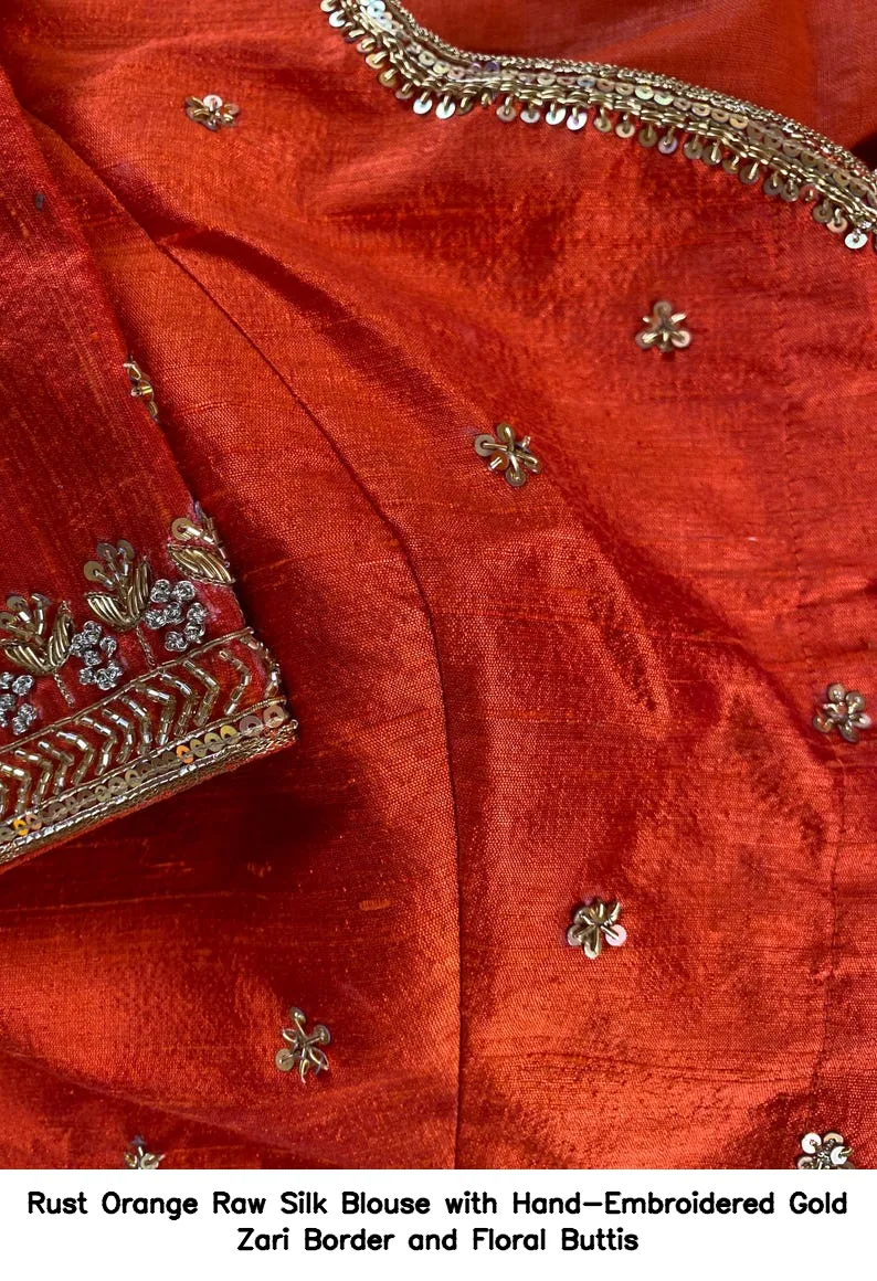 Rust Orange Raw Silk Blouse with Hand-Embroidered Gold Zari Border and Floral Buttis