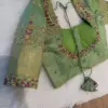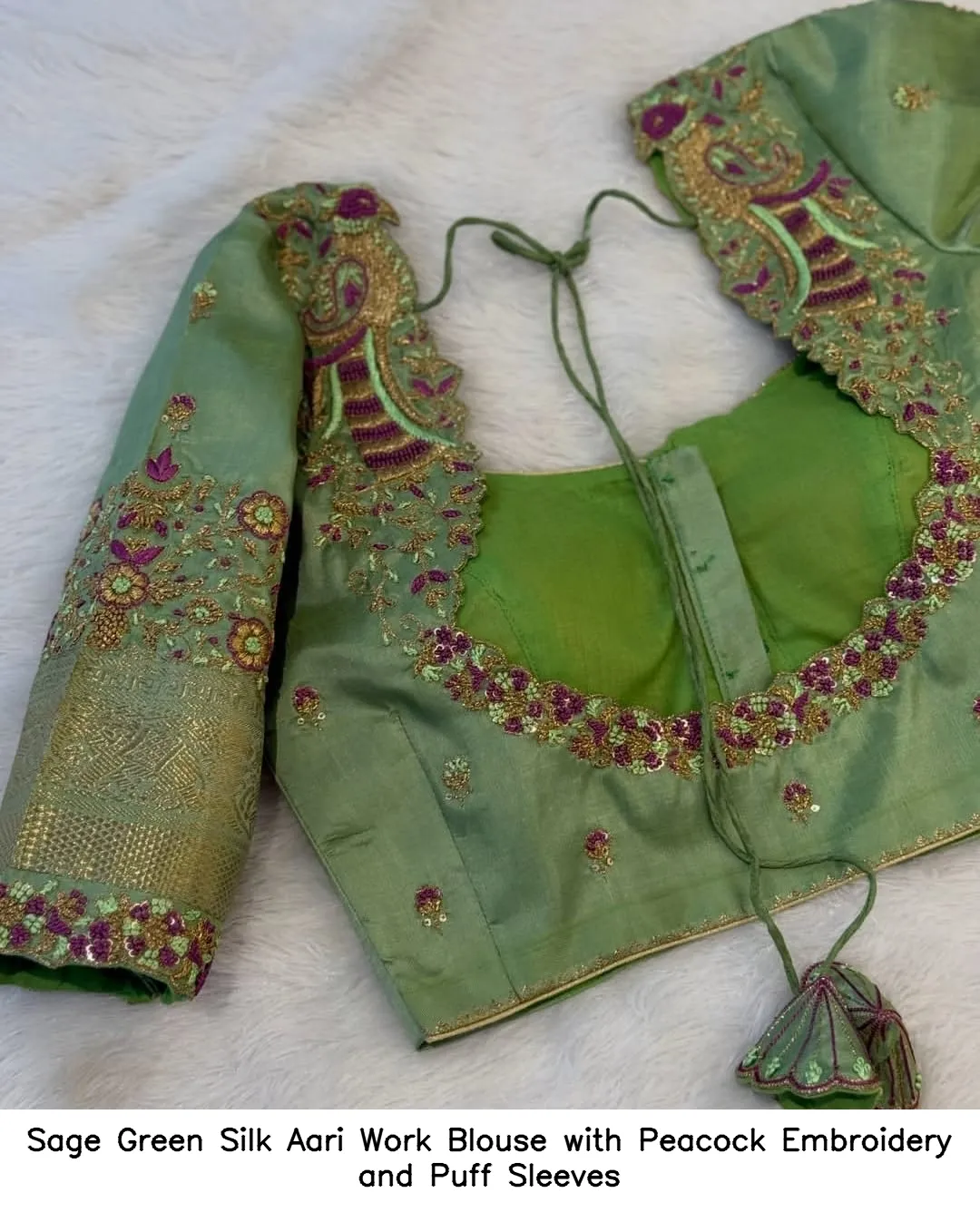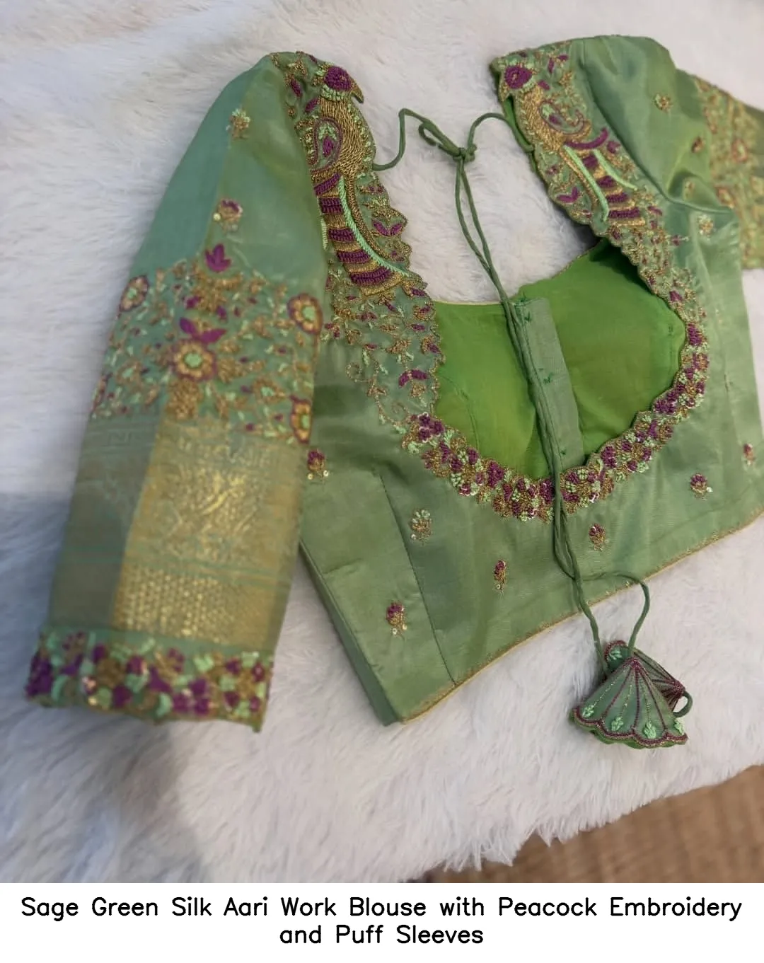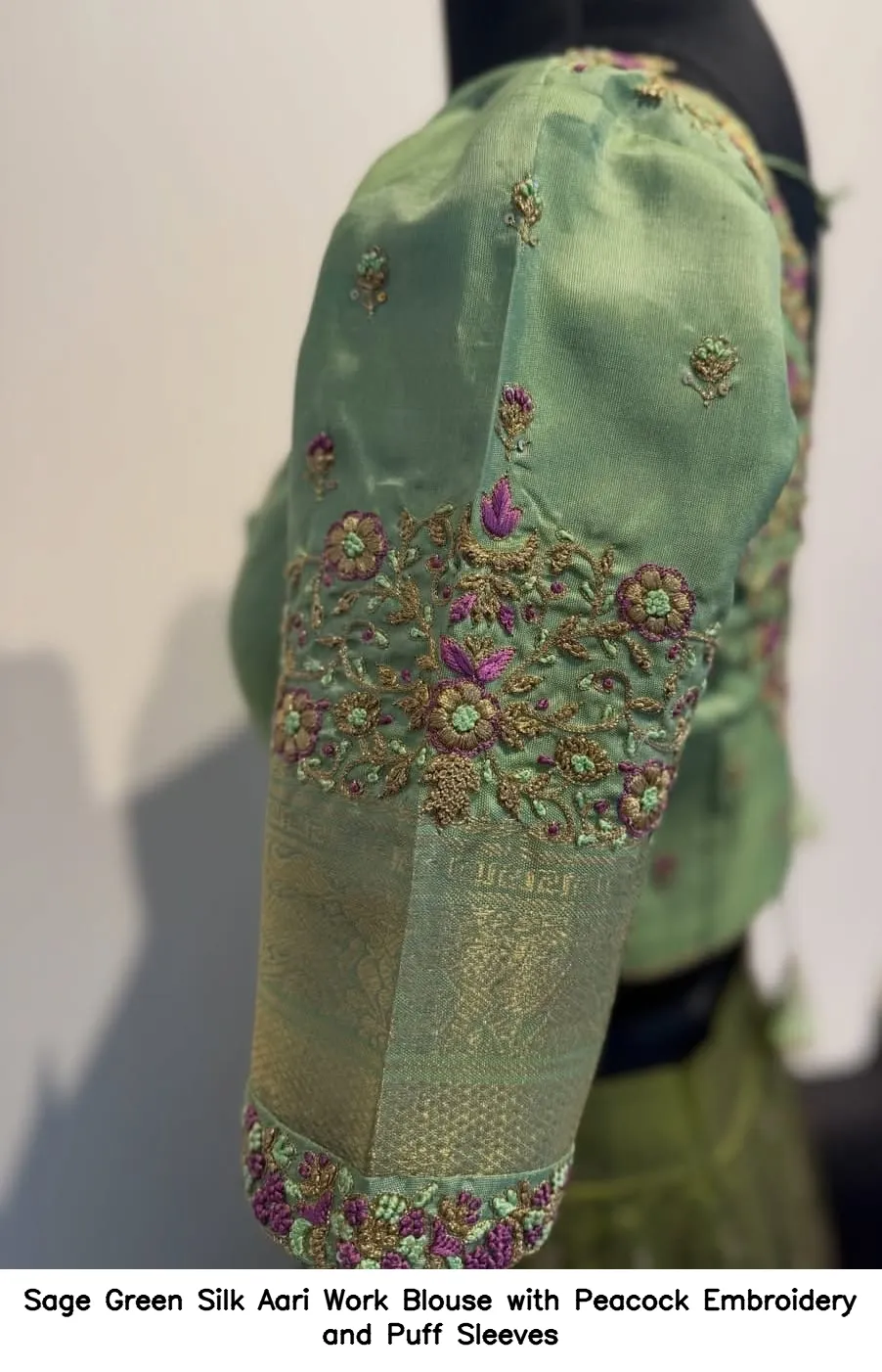 Sage Green Silk Aari Work Blouse with Peacock Embroidery and Puff Sleeves