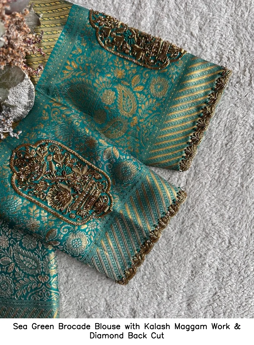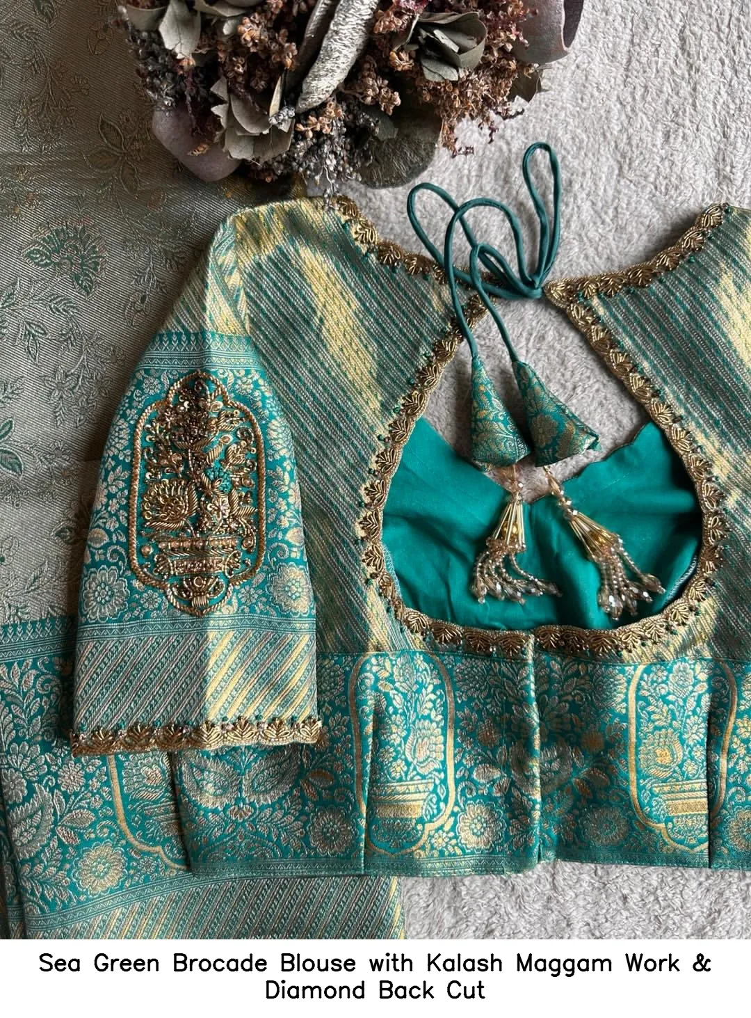 Introducing the exquisite Sea Green Brocade Blouse with Kalash Maggam Work & Diamond Back Cut. This stunning blouse features intricate maggam work that adds elegance to your traditional attire. Crafted with care, it seamlessly blends style and comfort, making it a must-have in your wardrobe.