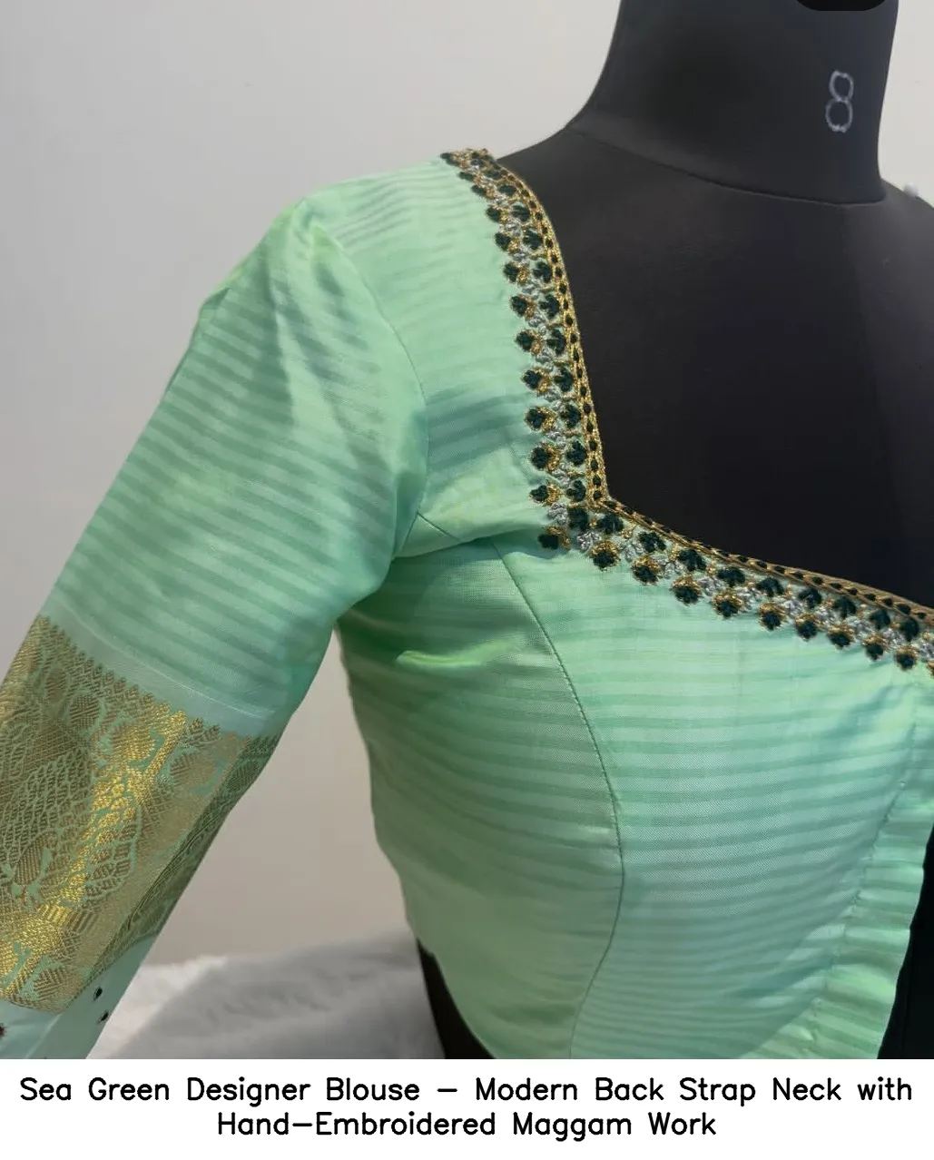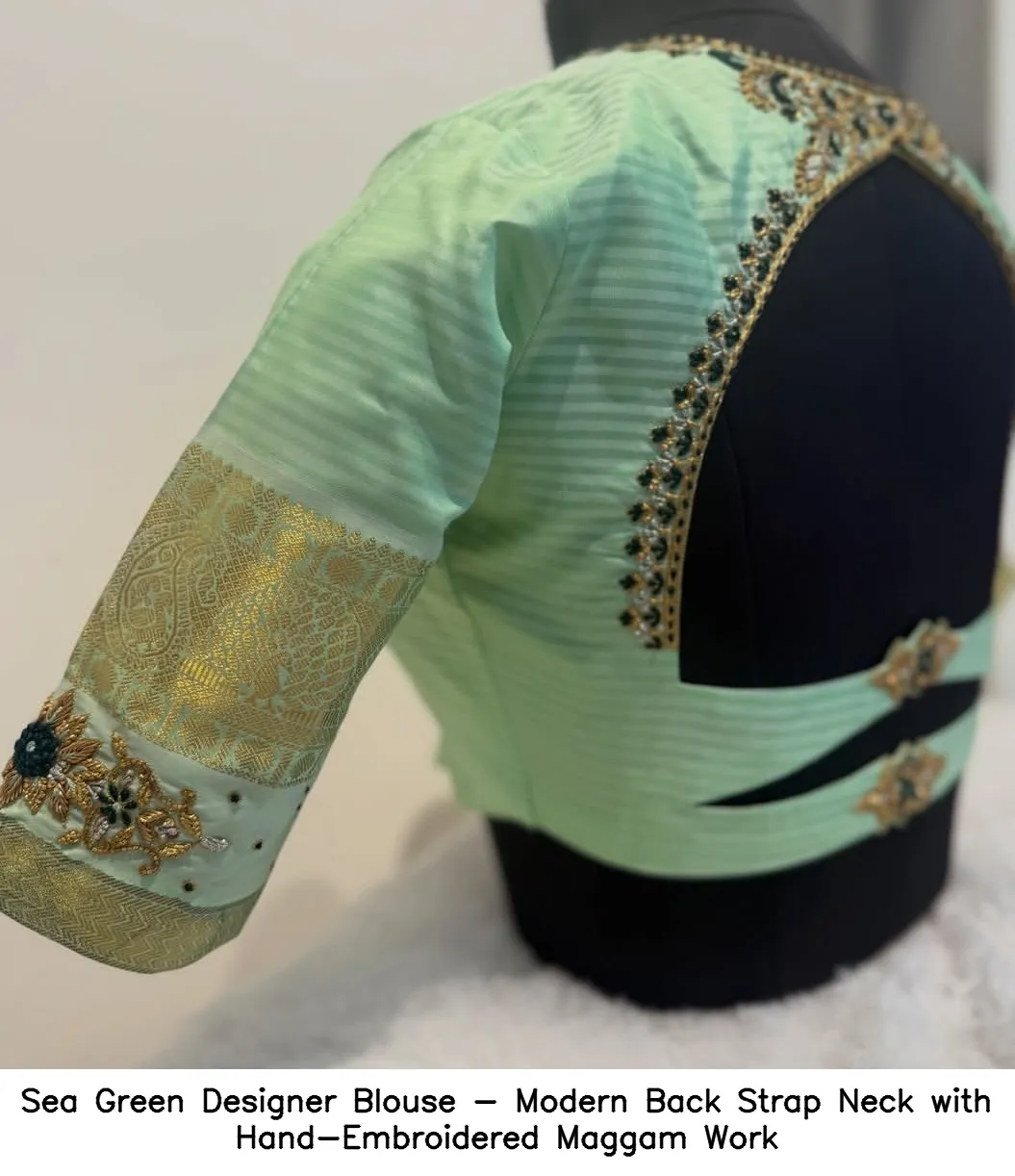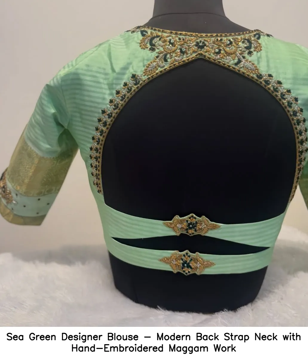 Sea Green Designer Blouse – Modern Back Strap Neck with Hand-Embroidered Maggam Work