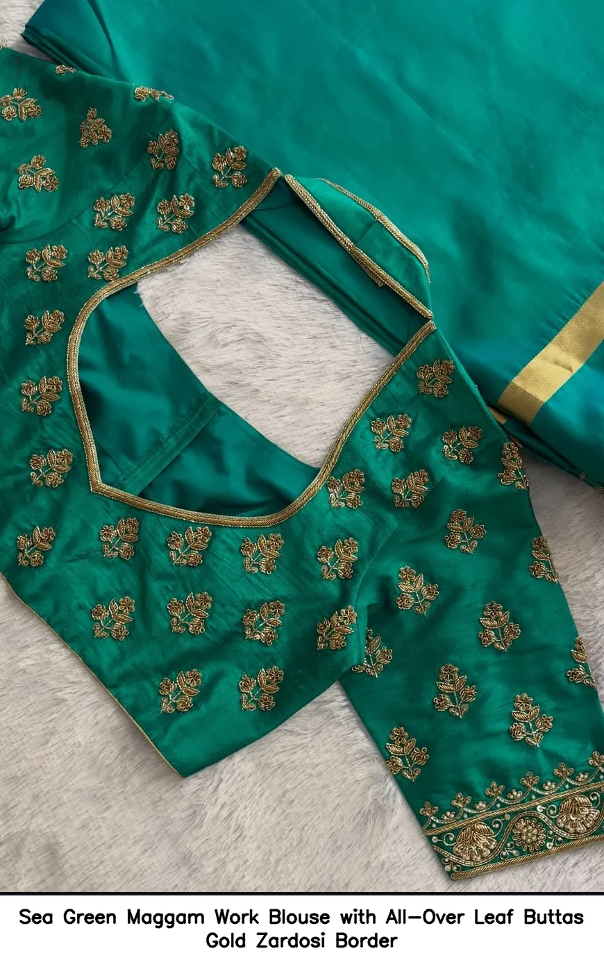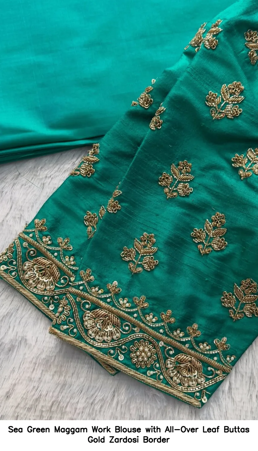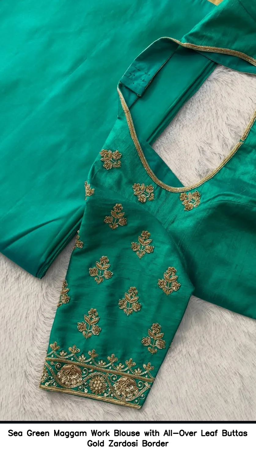 Introducing the stunning Sea Green Maggam Work Blouse with All-Over Leaf Buttas Gold Zardosi Border. This exquisite piece is designed to elevate your traditional attire while providing a touch of elegance. Crafted with precision, this blouse is a perfect addition to your wardrobe.