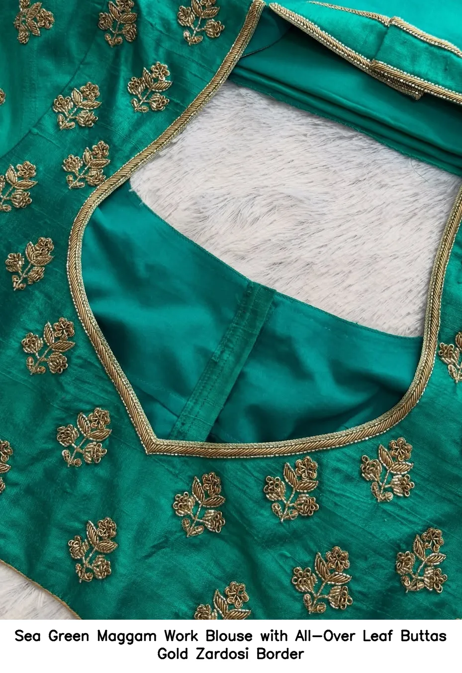 To maintain the beauty of your Sea Green Maggam Work Blouse with All-Over Leaf Buttas Gold Zardosi Border, hand wash in cold water and avoid harsh detergents. Iron on low heat to preserve the intricate work.