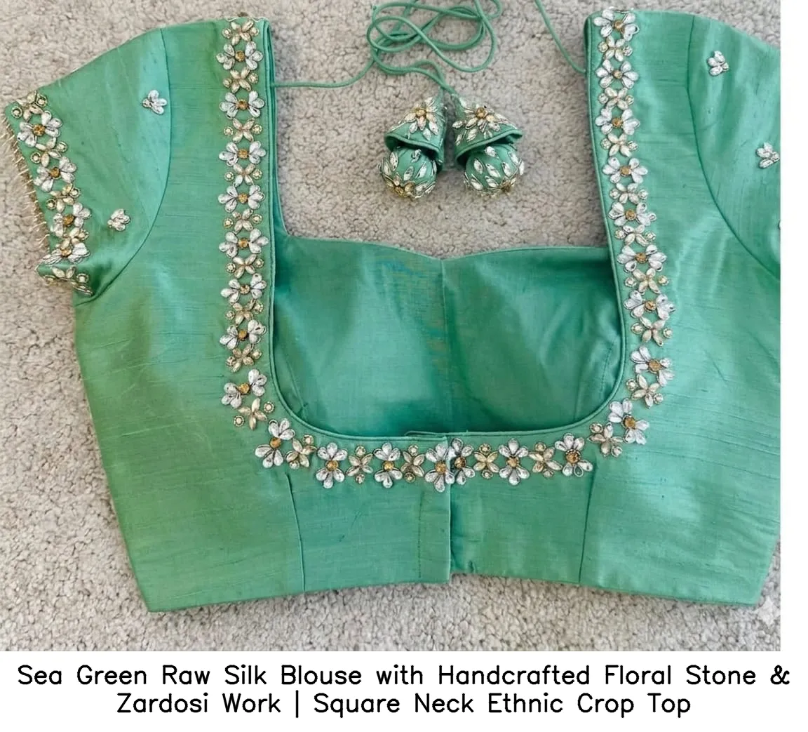 Product Name: Sea Green Raw Silk Blouse with Handcrafted Floral Stone & Zardosi Work | Square Neck Ethnic Crop Top