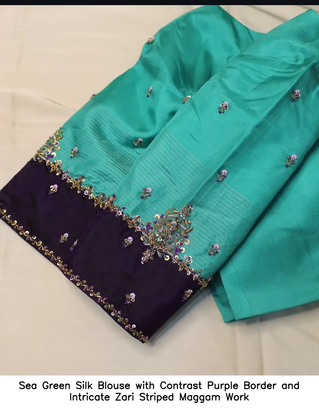 To maintain the beauty of your Sea Green Silk Blouse with Contrast Purple Border and Intricate Zari Striped Maggam Work, dry clean only. Avoid direct sunlight to preserve the colors and avoid harsh detergents.