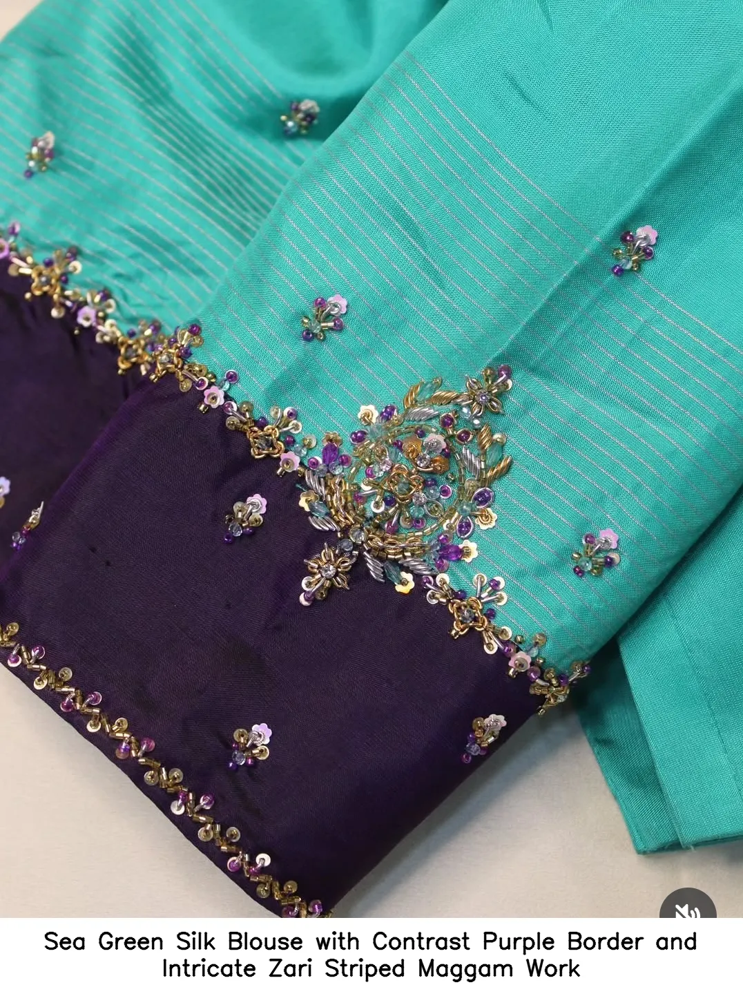 Introducing the exquisite Sea Green Silk Blouse with Contrast Purple Border and Intricate Zari Striped Maggam Work. This elegant blouse is designed to make you stand out at any occasion. The rich silk fabric combined with a vibrant purple border adds a touch of sophistication to your ensemble.