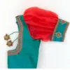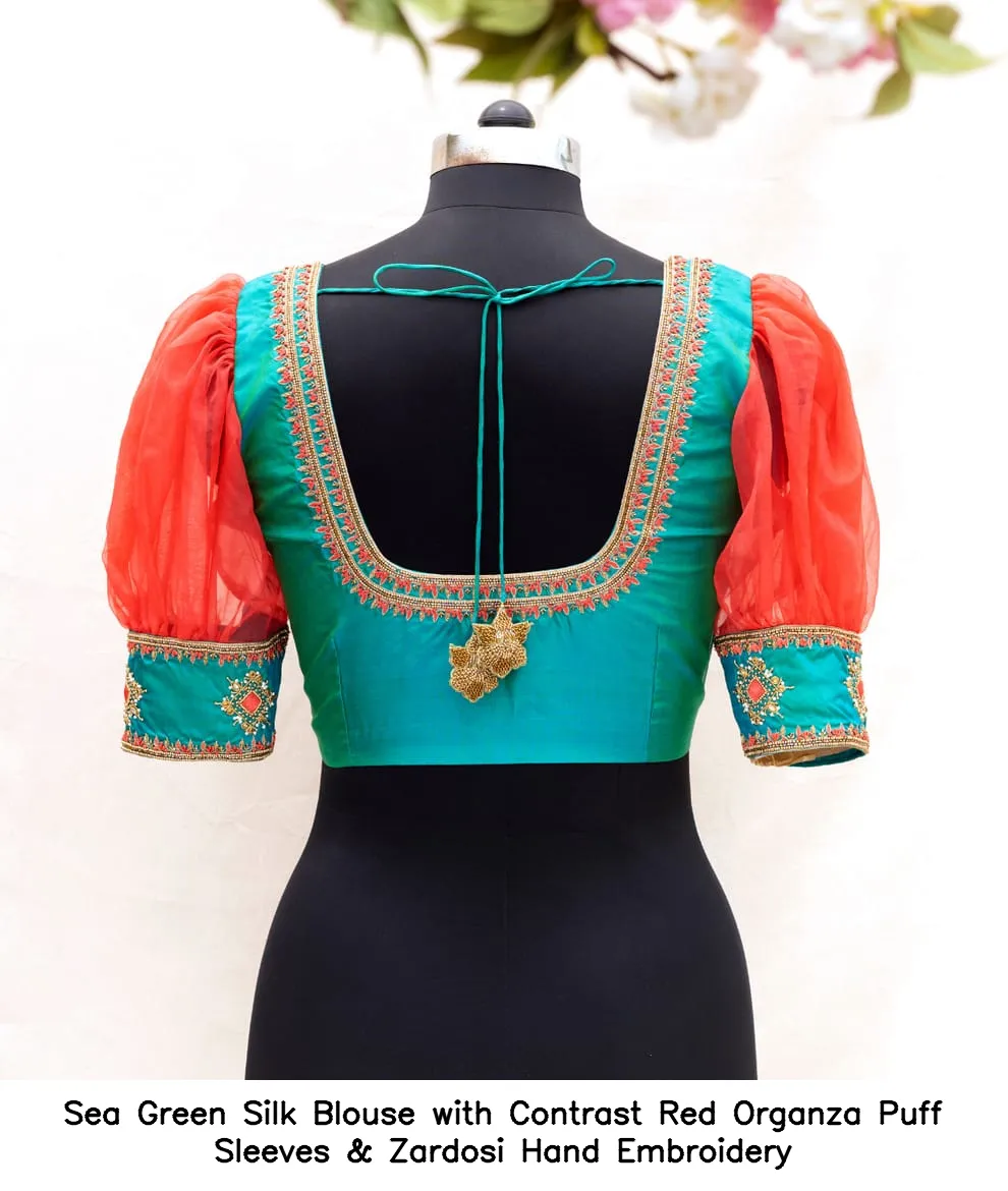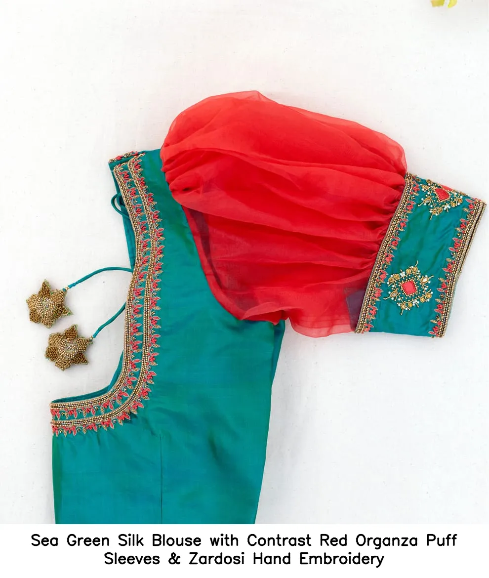​​​​​​​​Sea Green Silk Blouse with Contrast Red Organza Puff Sleeves & Zardosi Hand Embroidery