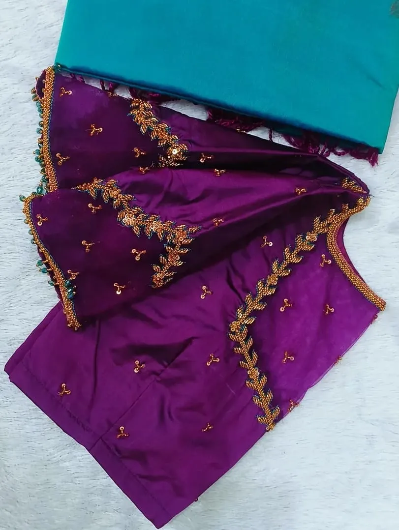 This blouse is crafted from premium half pattu fabric. It comes in vibrant colors including Red, Pink, Blue, Purple, and Wine. For more options, browse our collection today. Each color adds a unique flair to your bridal ensemble.