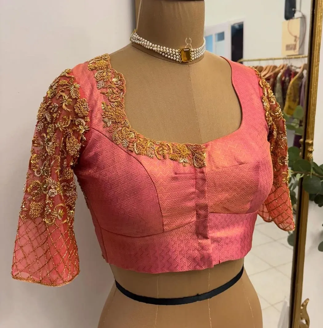 Shop Orange Raw Silk Net Bridal Blouse Online Budget Maggam Aari Work Design for a stunning bridal look. This exquisite blouse combines elegance and comfort perfectly. Moreover, the intricate maggam aari work adds a touch of traditional charm. You will feel confident and beautiful in this piece.
