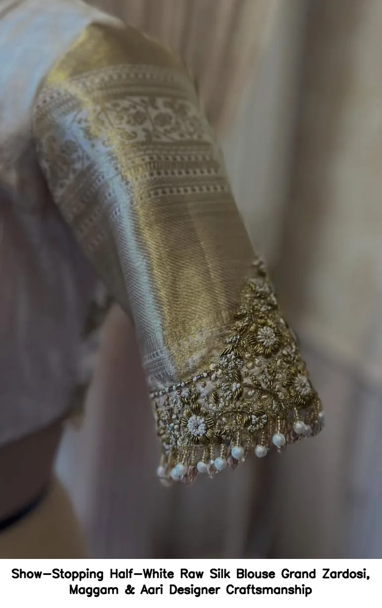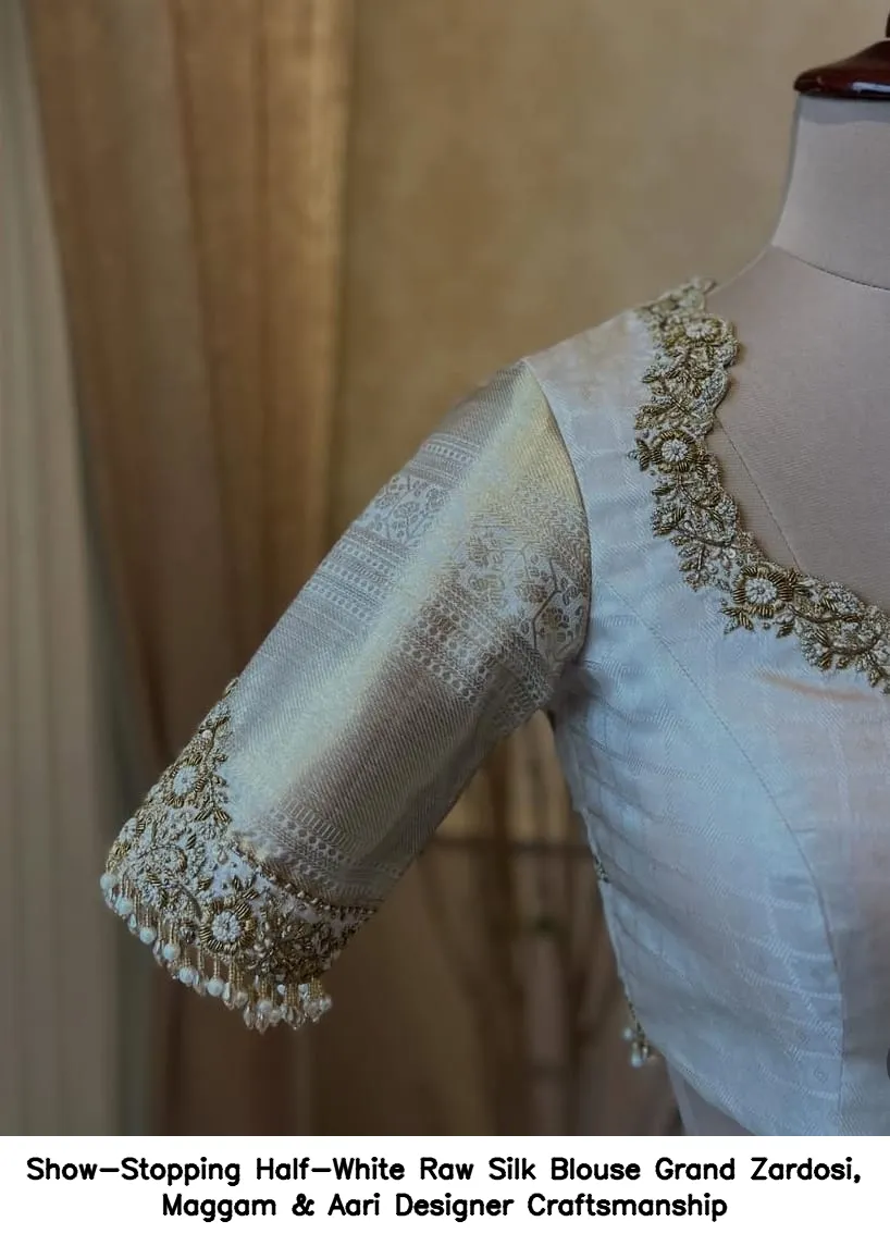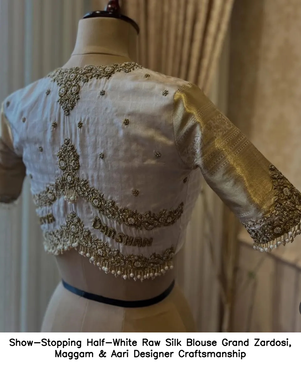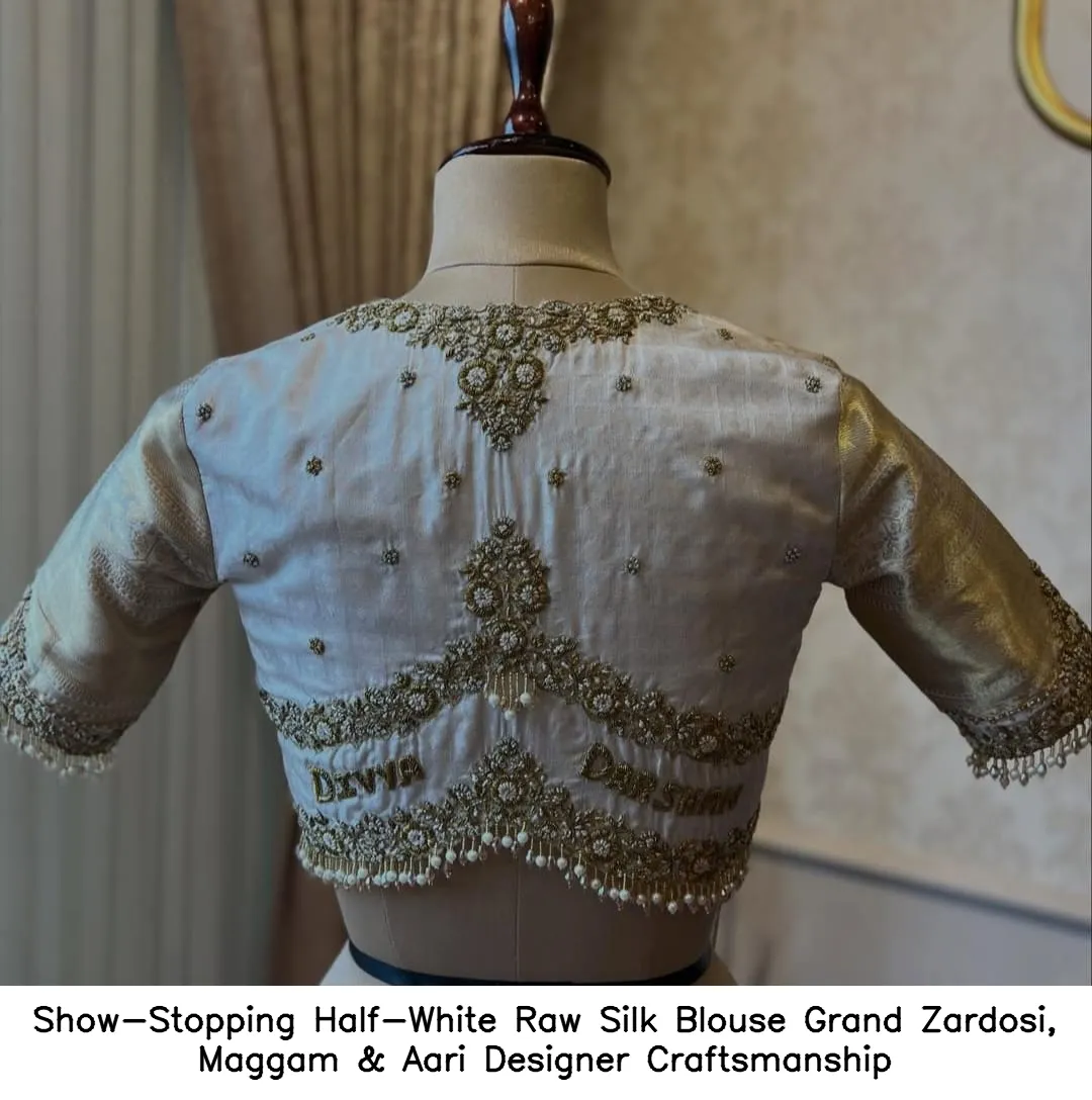Show-Stopping Half-White Raw Silk Blouse – Grand Zardosi, Maggam & Aari Designer Craftsmanship Features and Benefits