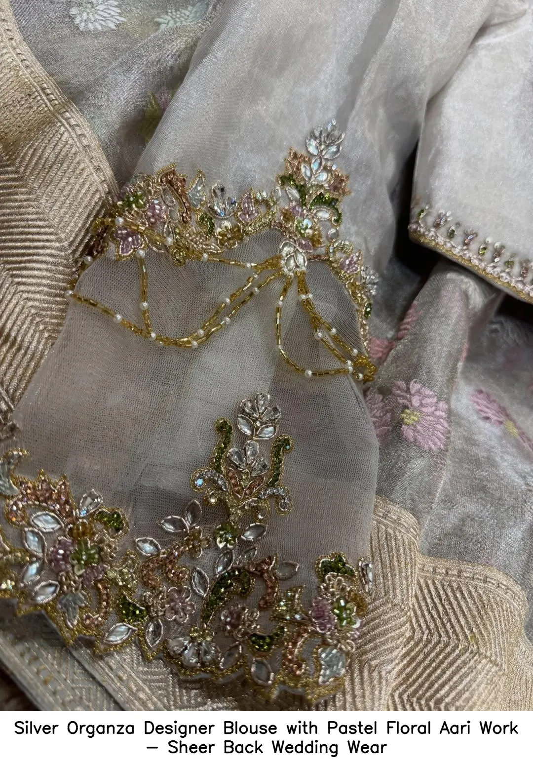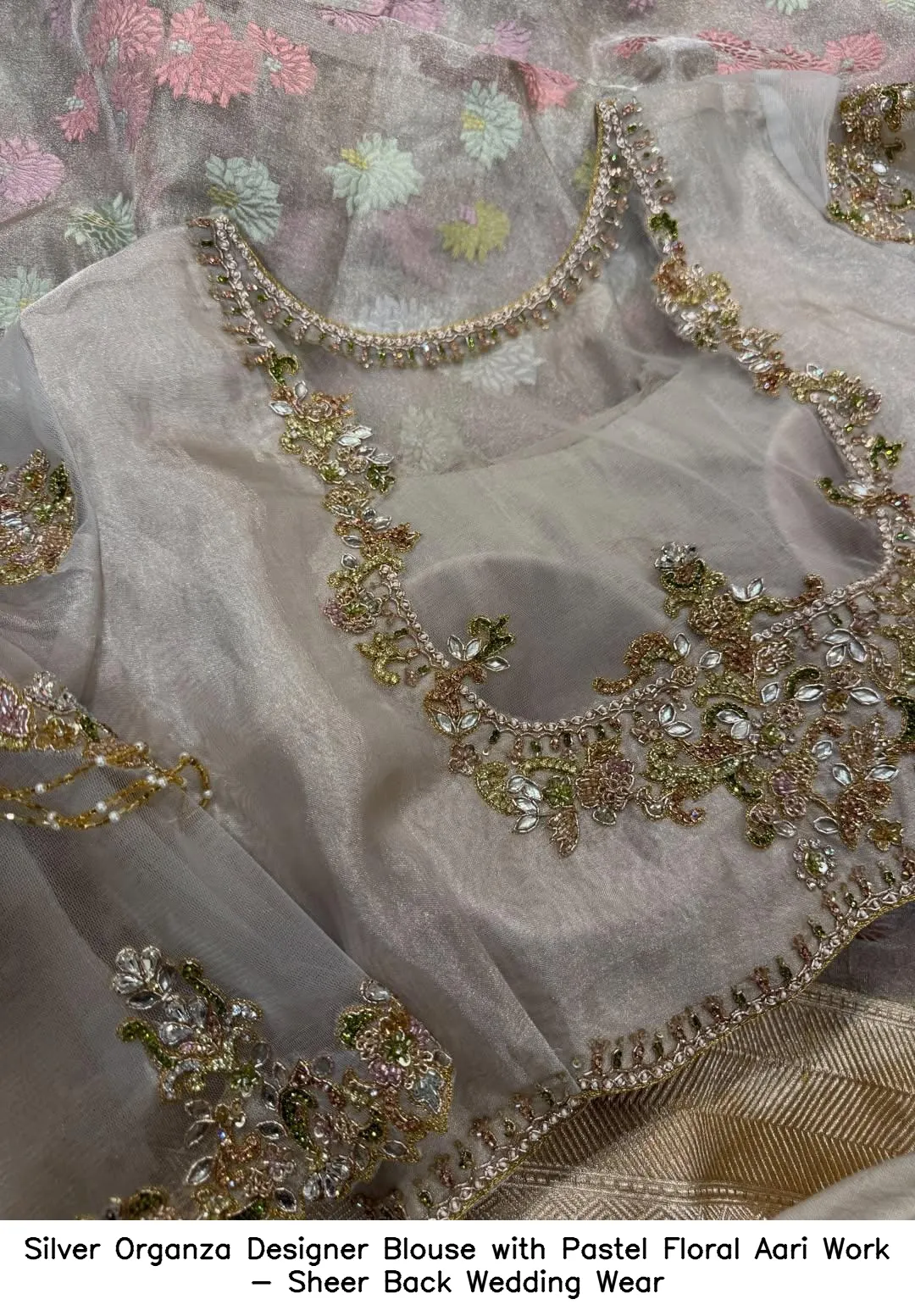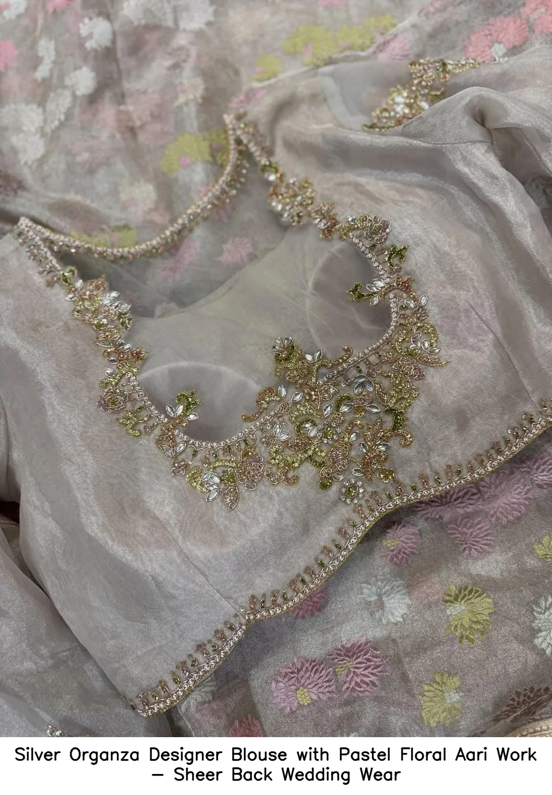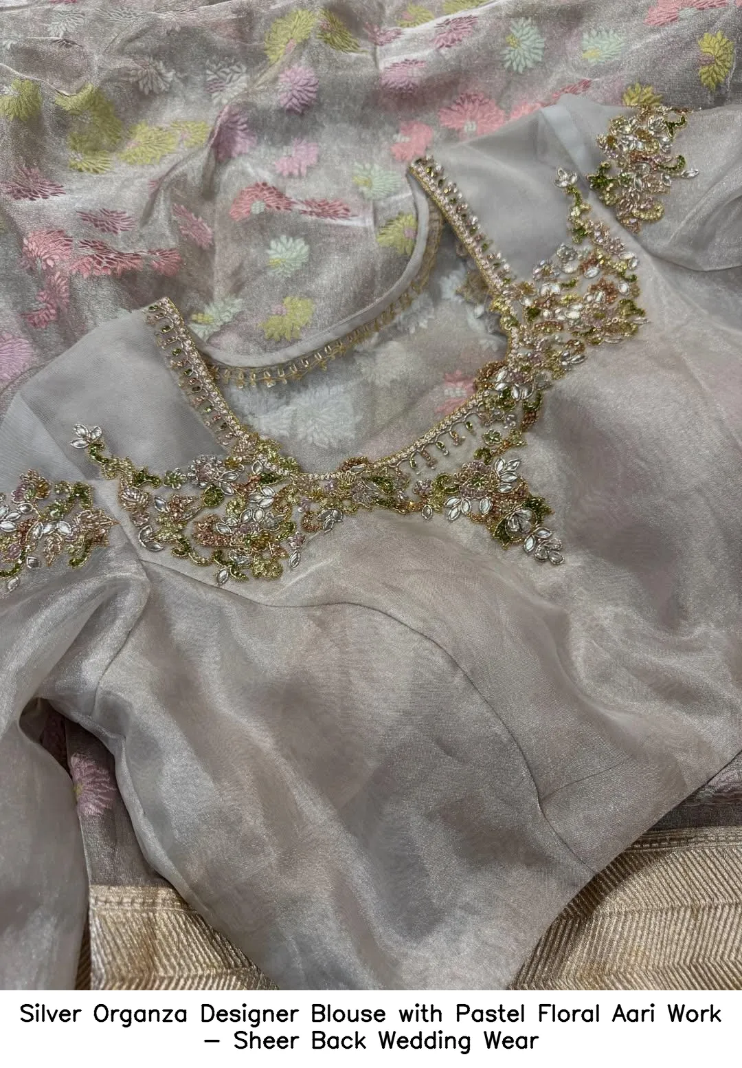 Silver Organza Designer Blouse with Pastel Floral Aari Work – Sheer Back Wedding Wear