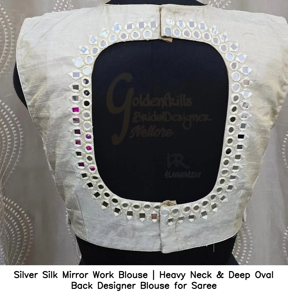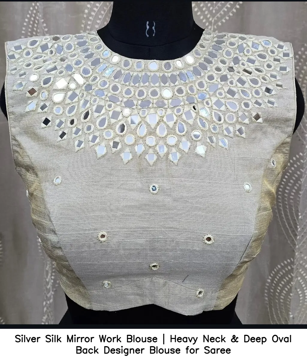 Silver Silk Mirror Work Blouse | Heavy Neck & Deep Oval Back Designer Blouse for Saree