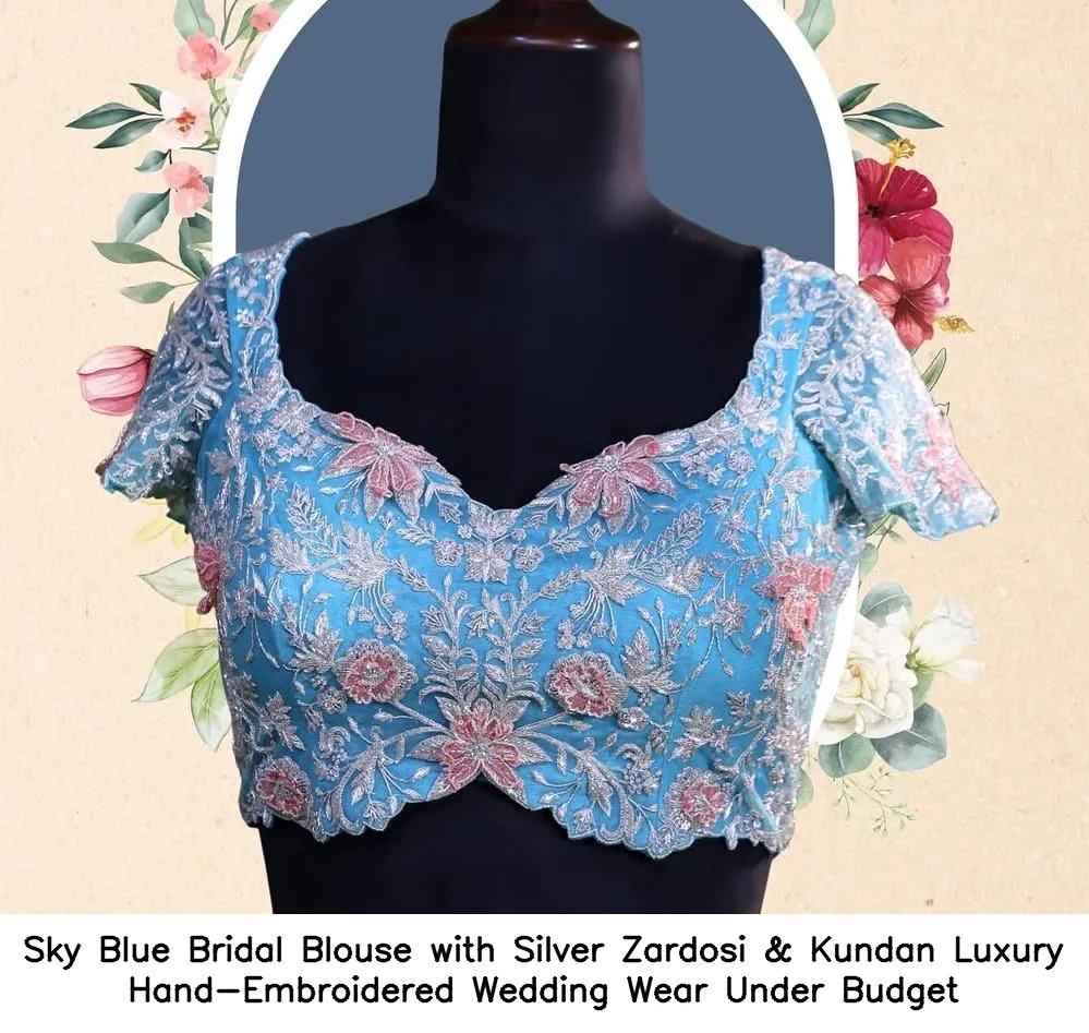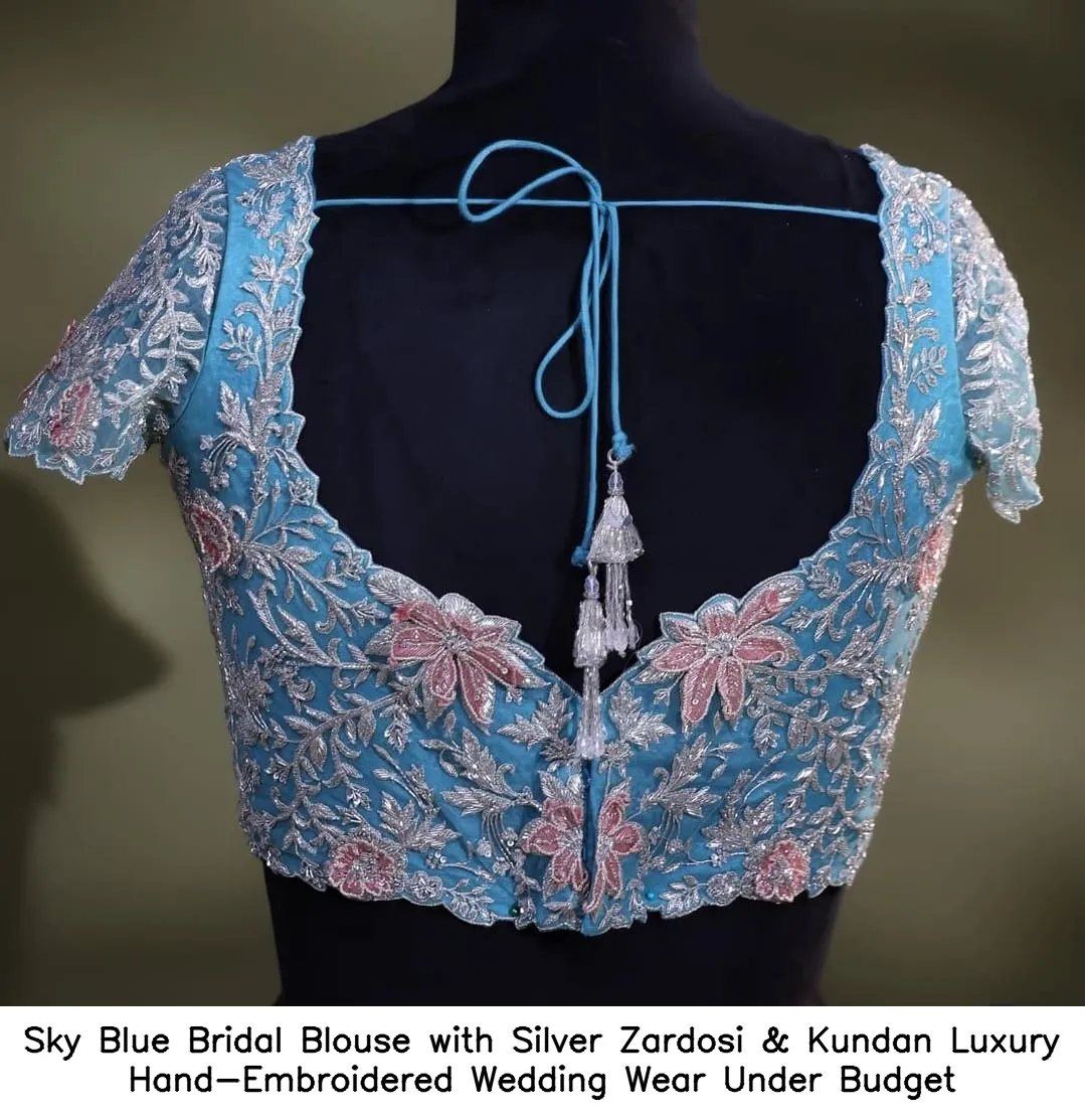 Sky Blue Bridal Blouse with Silver Zardosi & Kundan – Luxury Hand-Embroidered Wedding Wear Under Budget Features and Benefits