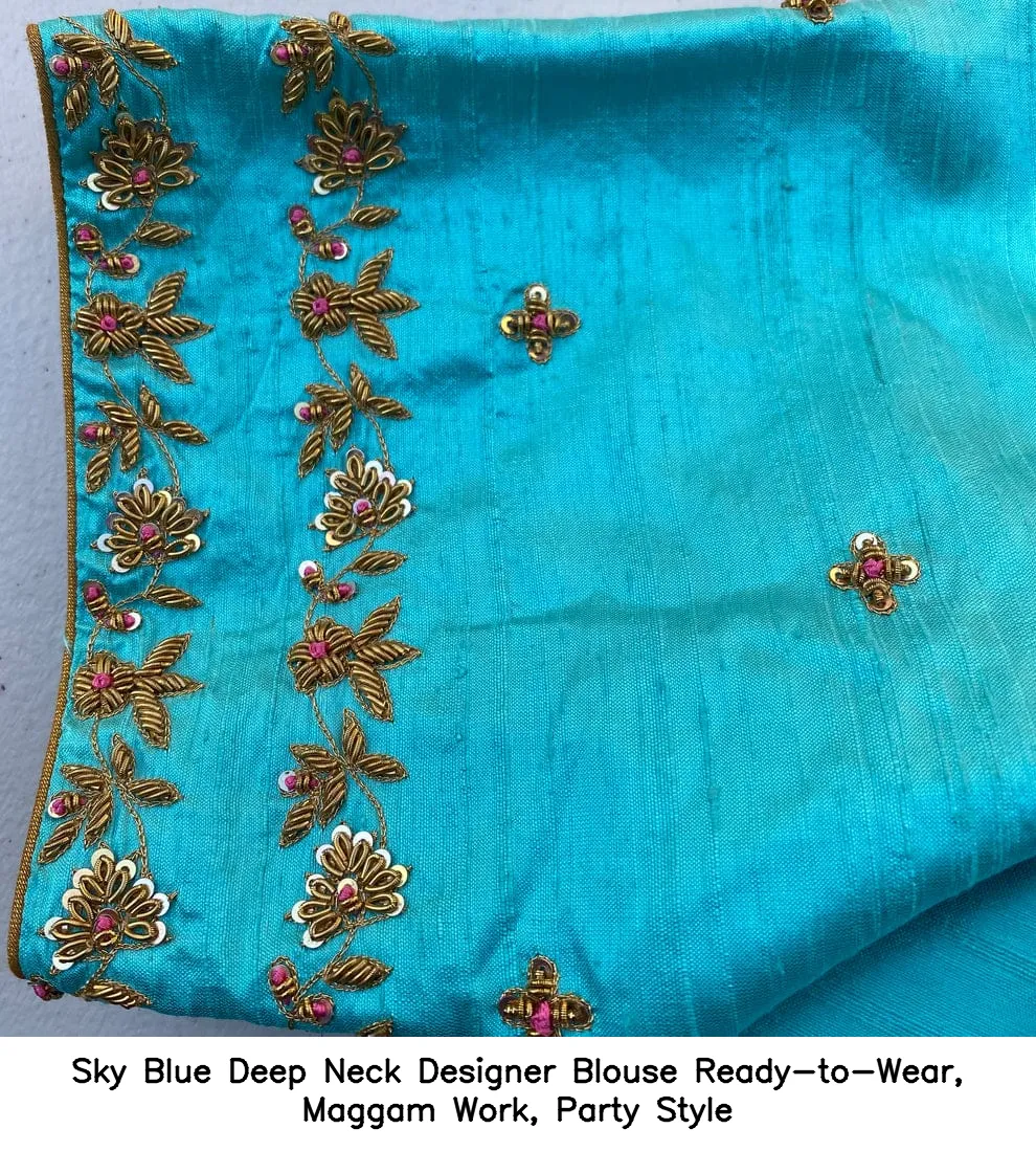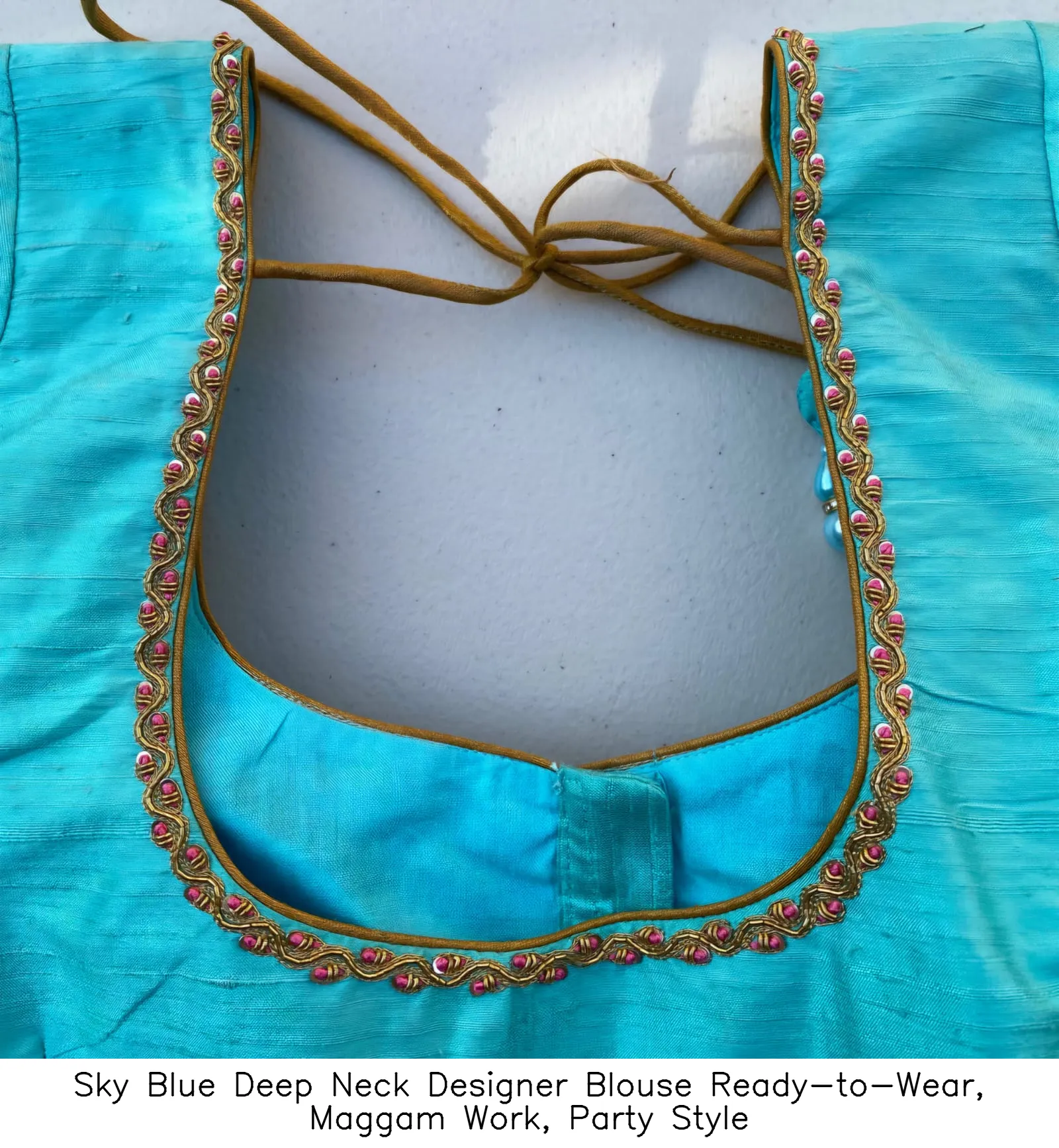Sky Blue Deep Neck Designer Blouse – Ready-to-Wear, Maggam Work, Party Style