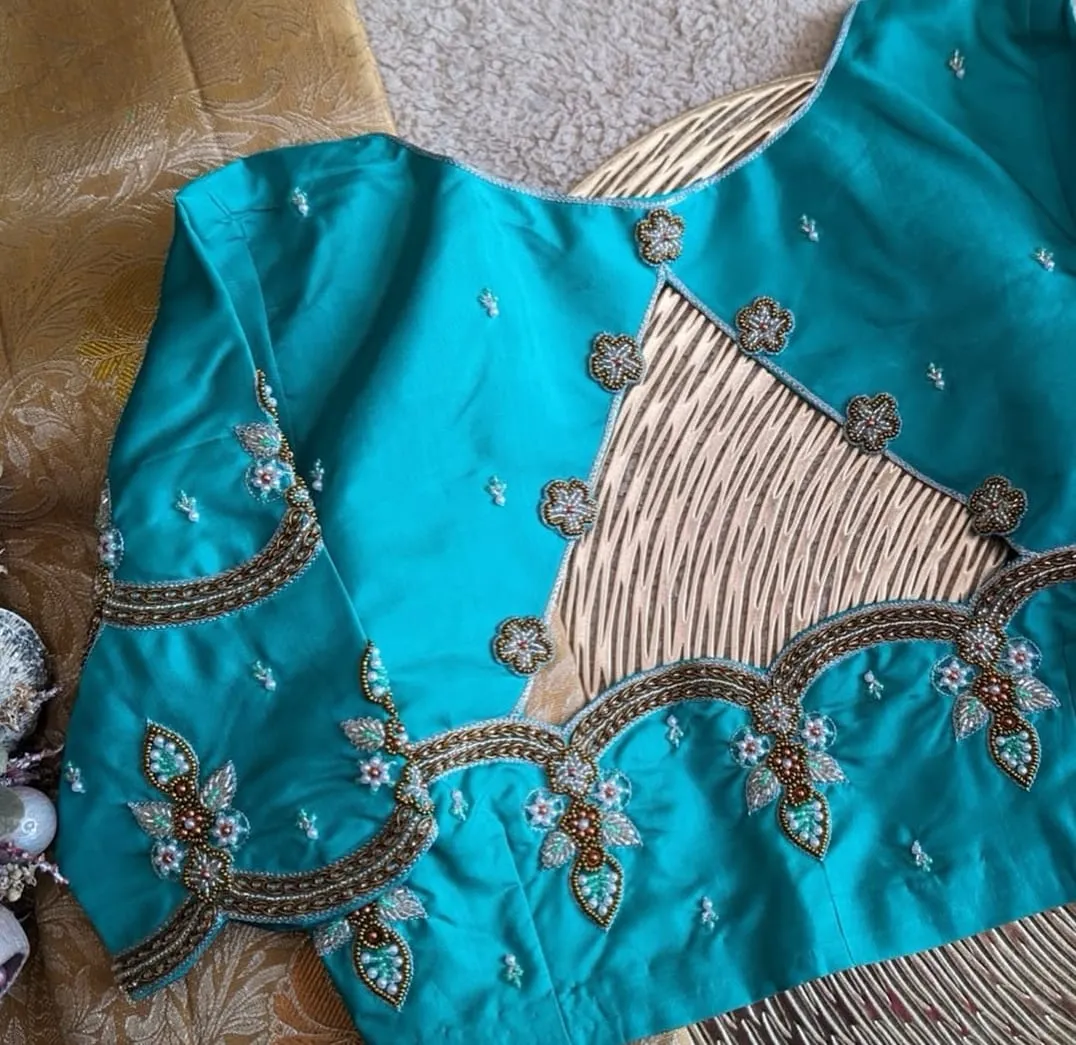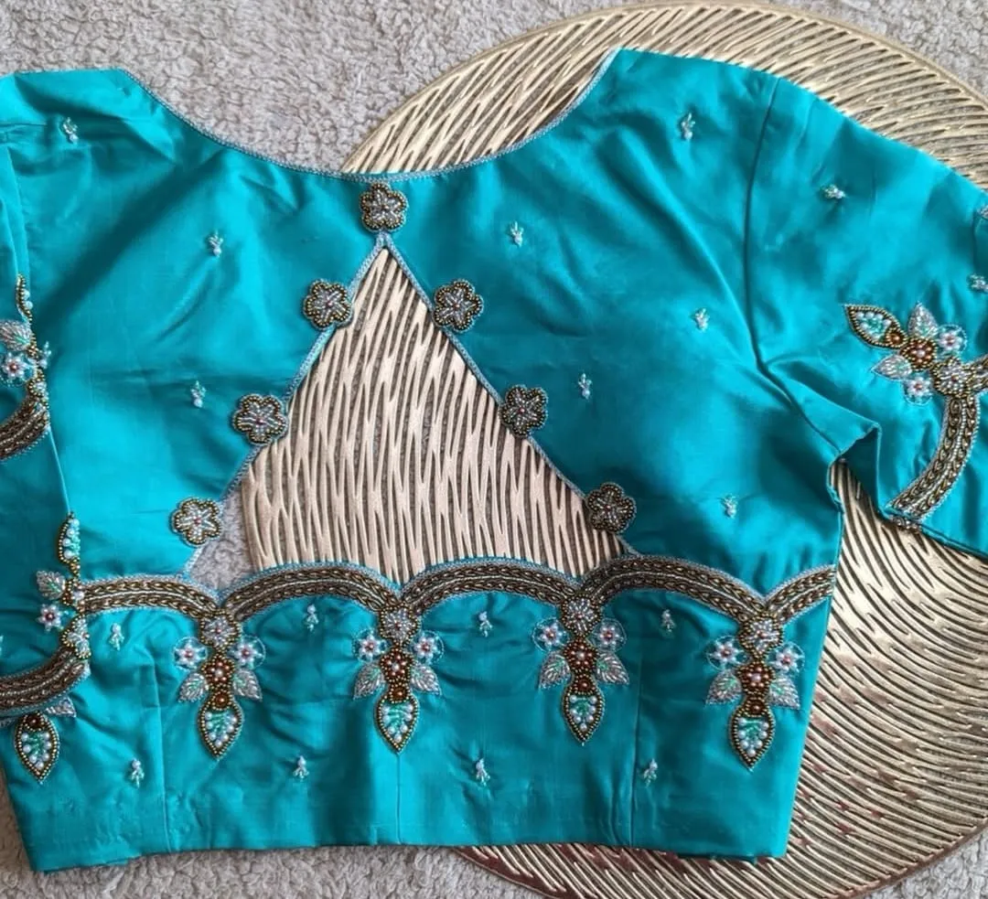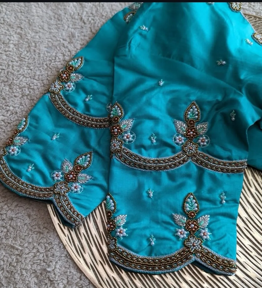 Sky Blue Pearls Maggam Work Blouse Elegant Bridal Party Wear Designer Blouse