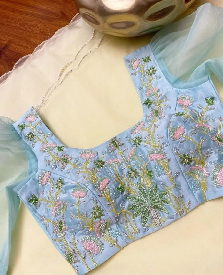 Product Name: Soft Pastel Blue Net Sleeve Aari Maggam Work Blouse MustHave Festive Edition