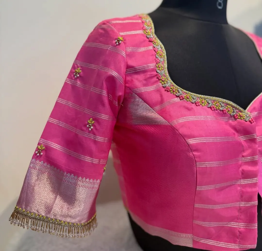 Sophisticated Baby Pink BlouseHigh Neck Minimal Maggam Masterpiece