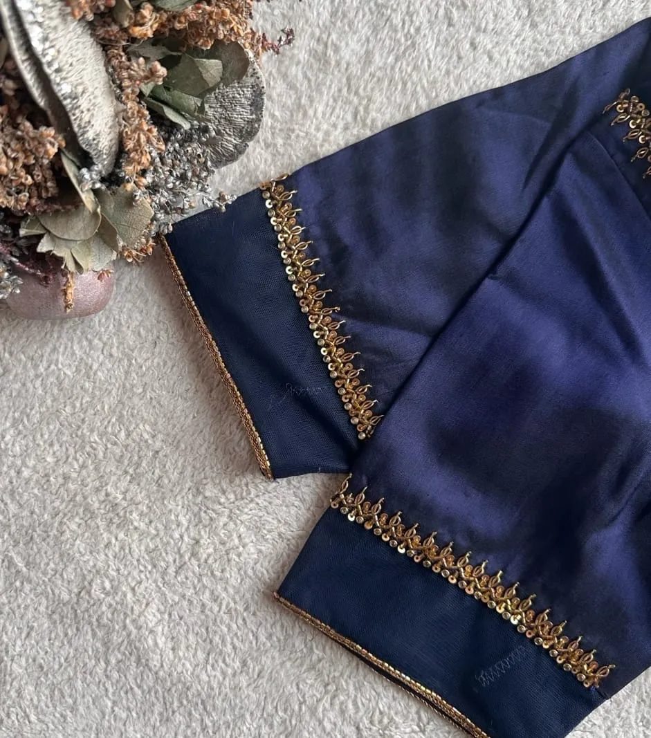Sophisticated Navy Blue Net Maggam Work Blouse with Deep Back Neck offers elegance and style. This blouse enhances your traditional attire, making it an ideal choice for festive occasions. Moreover, its intricate maggam work adds a touch of glamour, ensuring you stand out.