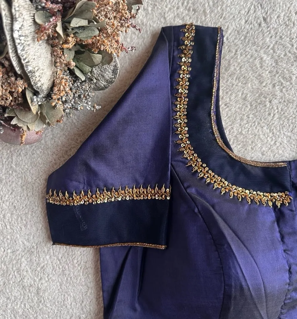 The Sophisticated Navy Blue Net Maggam Work Blouse with Deep Back Neck is made from half pattu fabric. It is available in sizes XL, XXL, and 3XL. You can choose from colors like Red, Pink, Blue, Purple, and Wine. For more options, browse our collection.