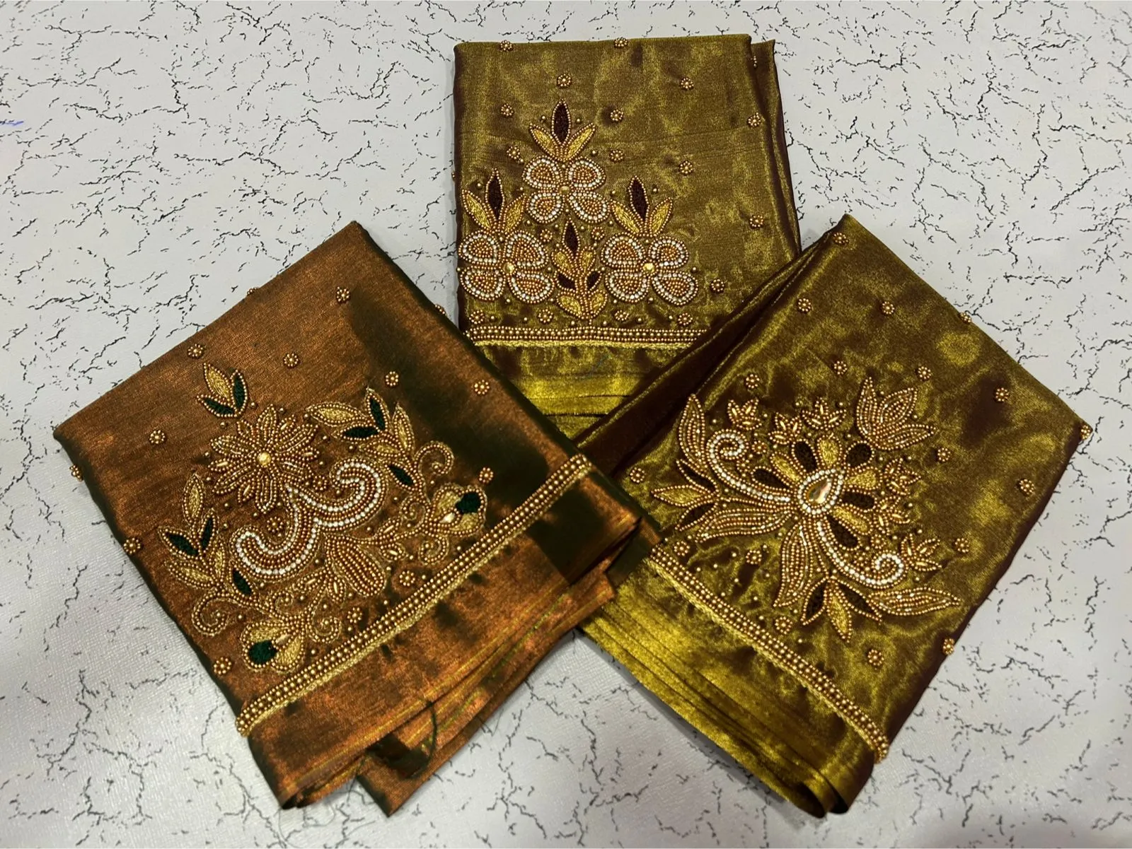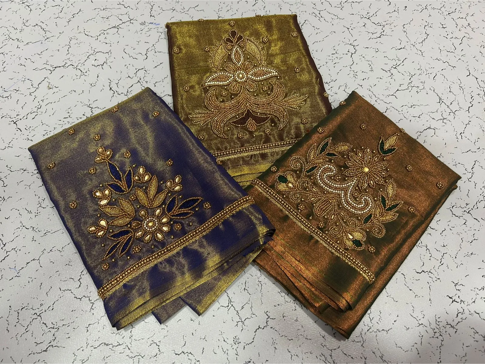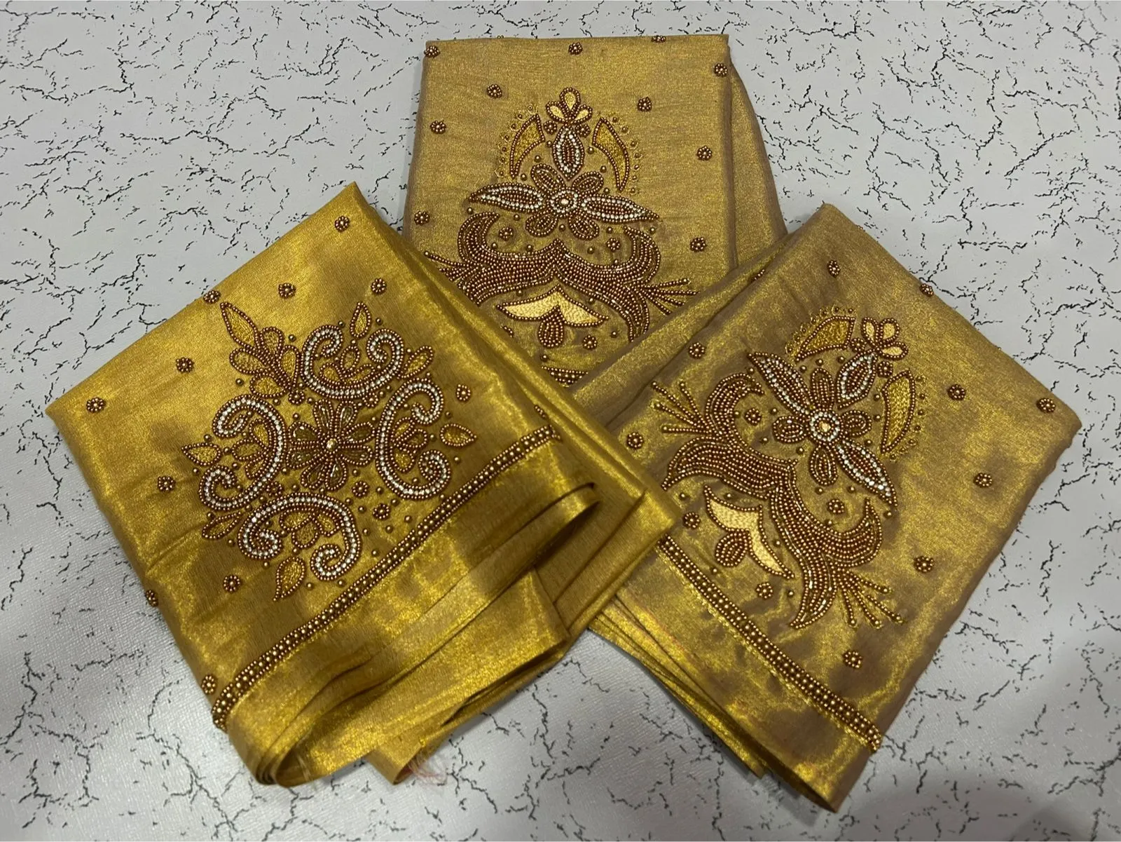 A: We use high-quality tissue fabric that is lightweight and breathable. The Aari embroidery adds elegance, ensuring you feel luxurious while wearing it. Enjoy the blend of comfort and style!