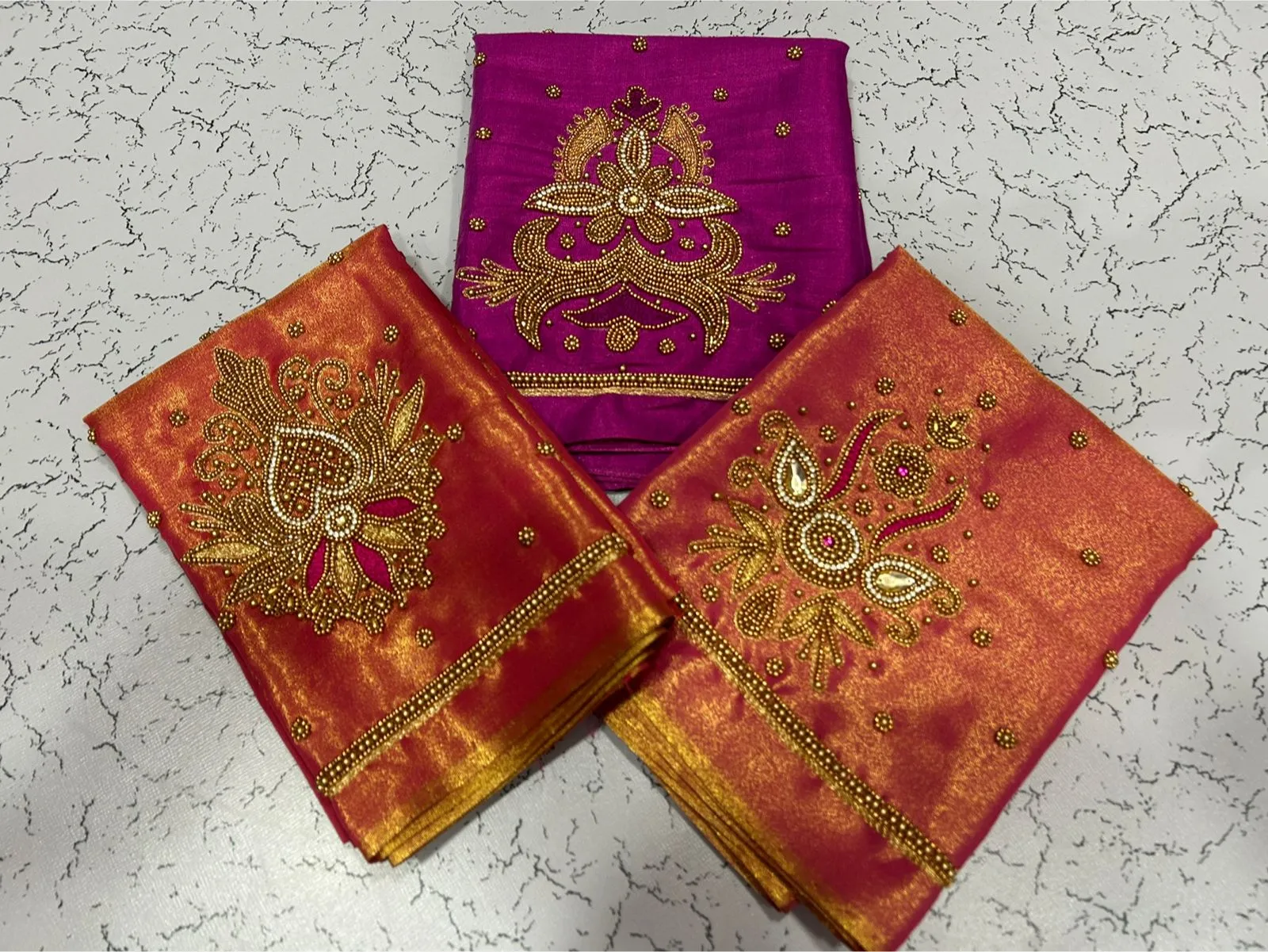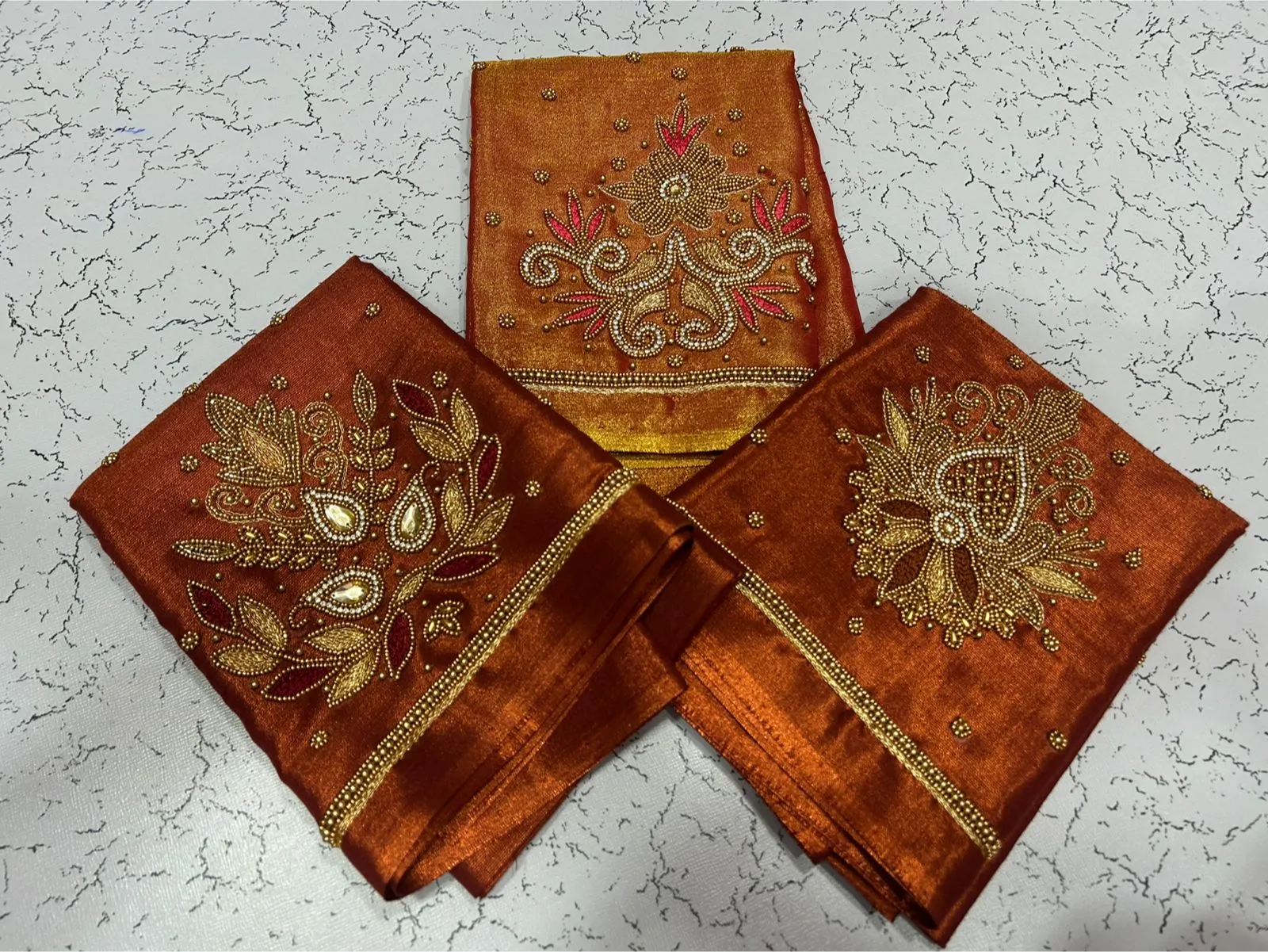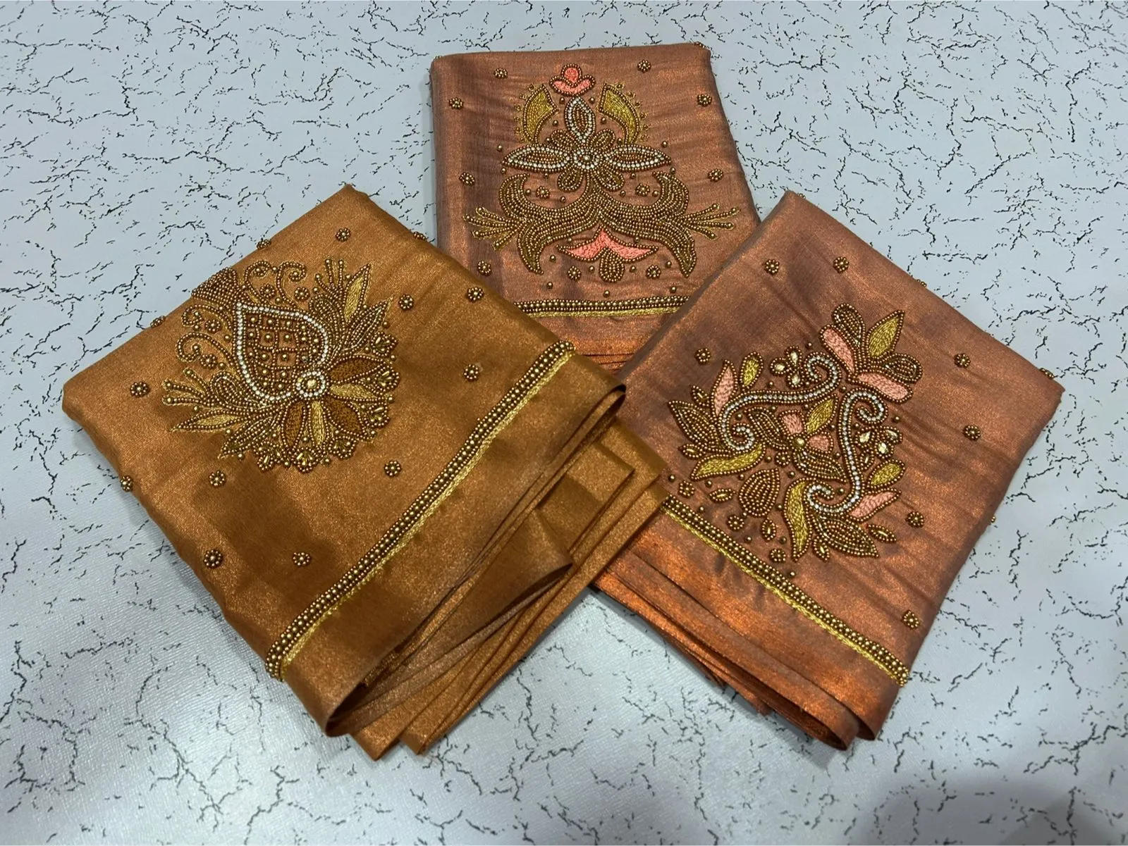 A: We use high-quality tissue fabric that is lightweight and breathable. The Aari embroidery adds elegance, ensuring you feel luxurious while wearing it. Enjoy the blend of comfort and style!