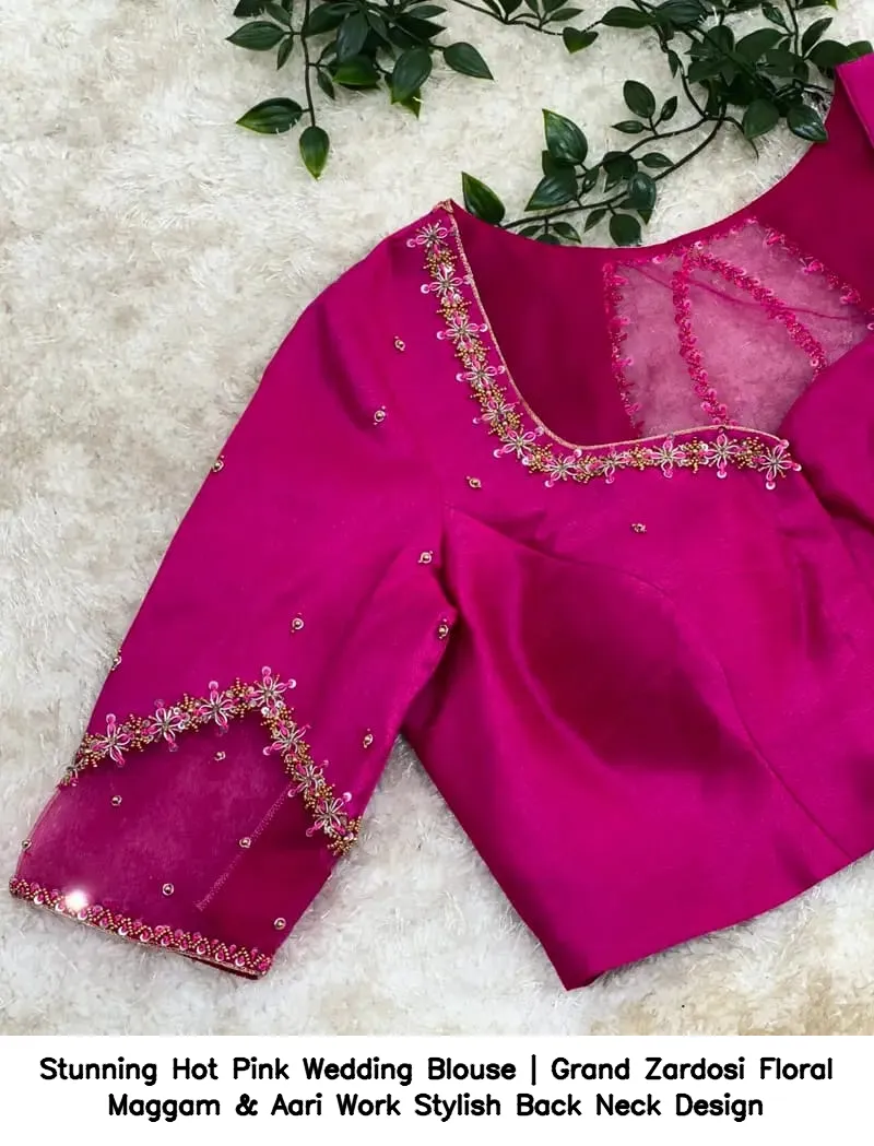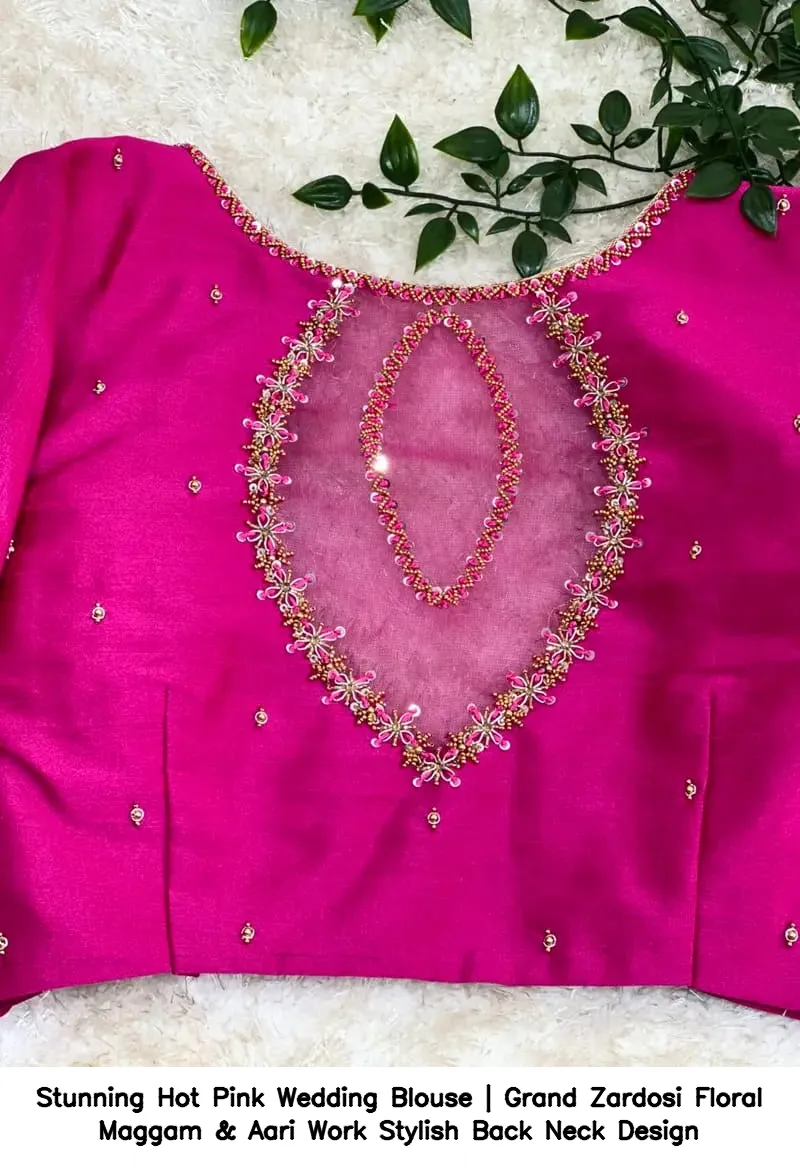 Stunning Hot Pink Wedding Blouse | Grand Zardosi Floral Maggam & Aari Work – Stylish Back Neck Design Features and Benefits