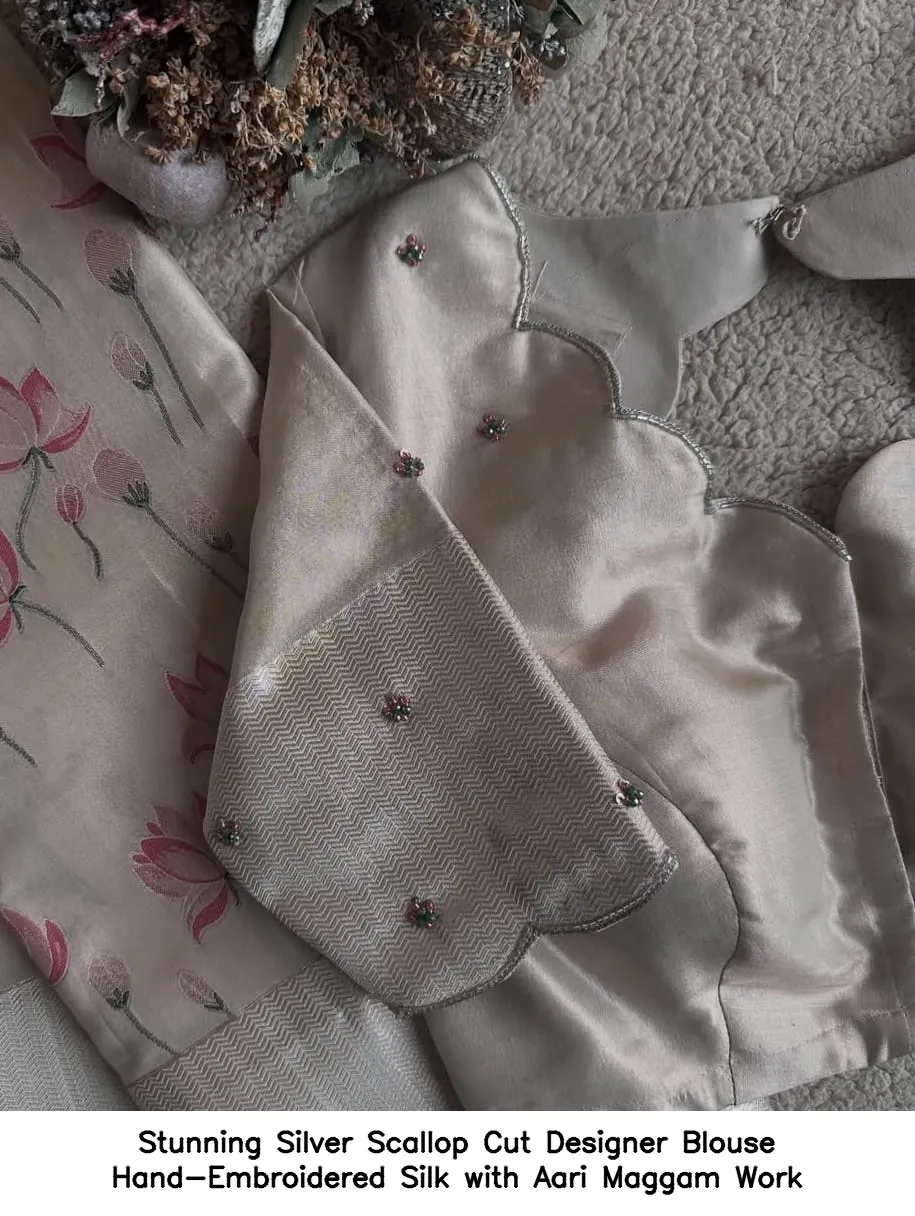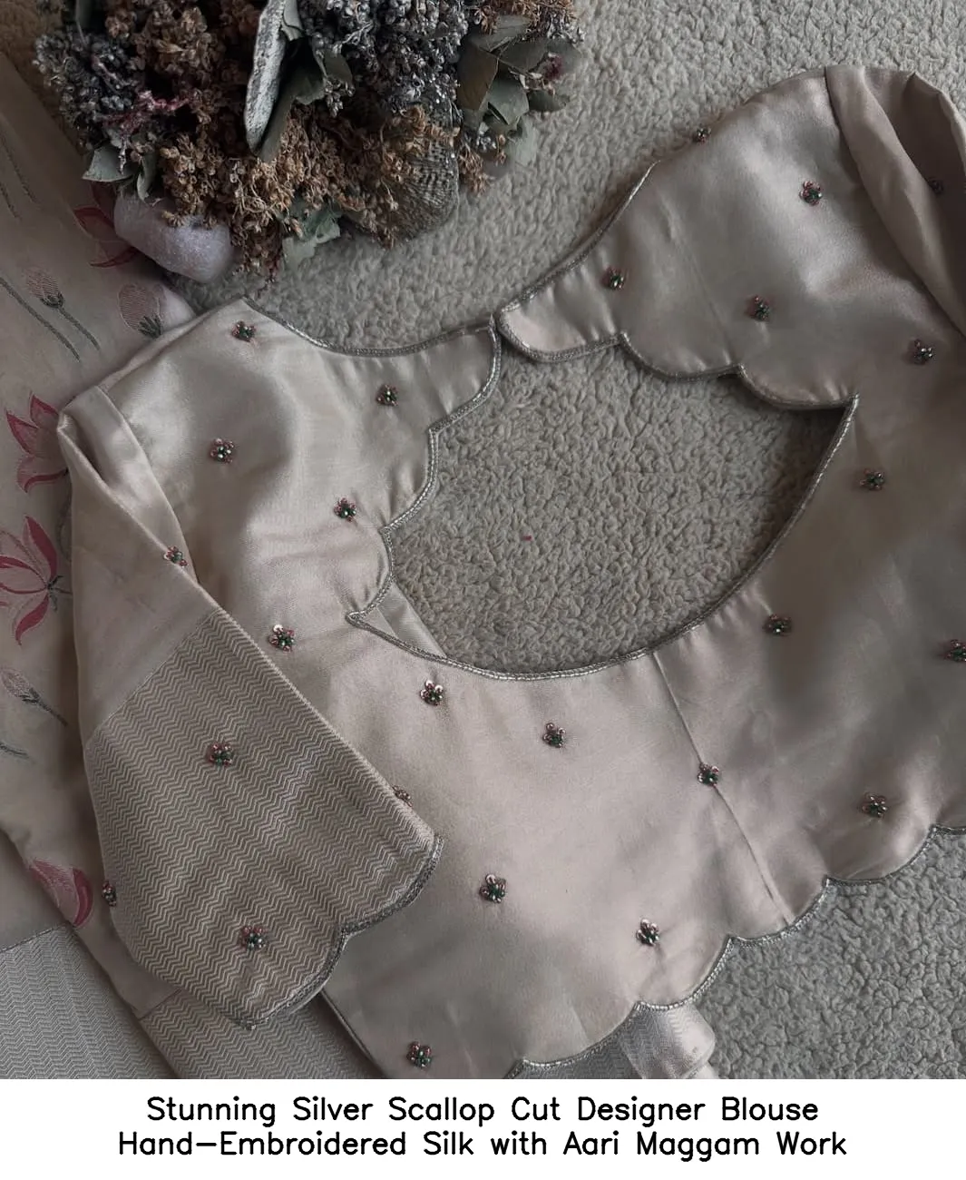 Why Choose Stunning Silver Scallop Cut Designer Blouse – Hand-Embroidered Silk with Aari Maggam Work?