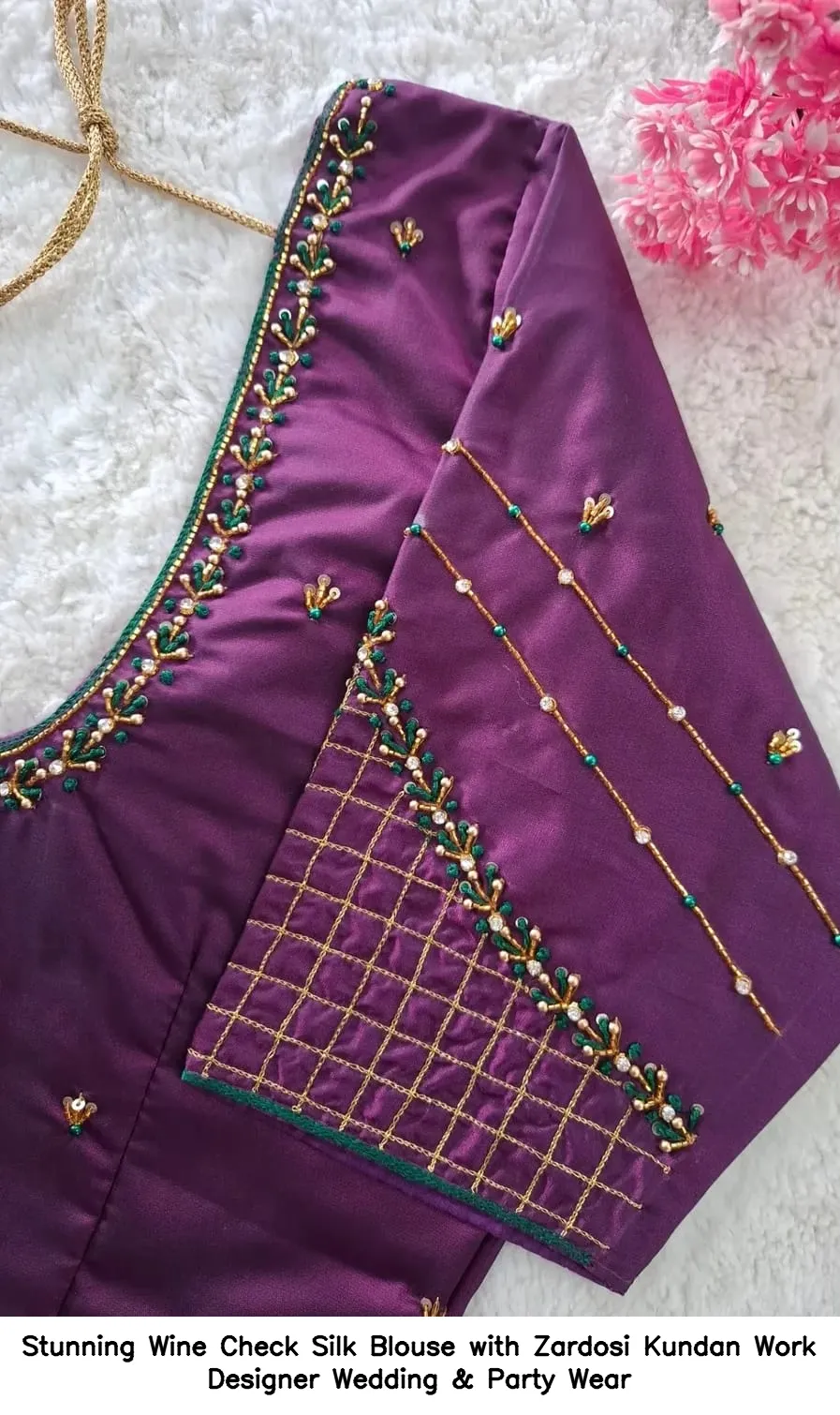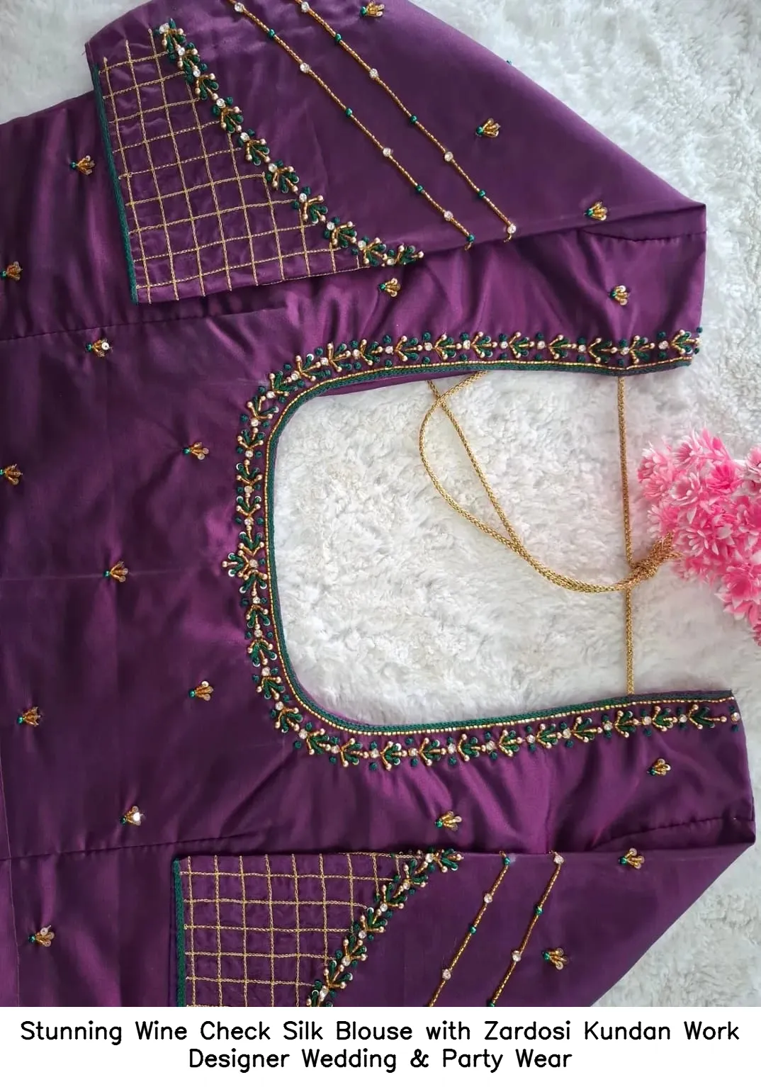 Stunning Wine Check Silk Blouse with Zardosi Kundan Work – Designer Wedding & Party Wear Features and Benefits