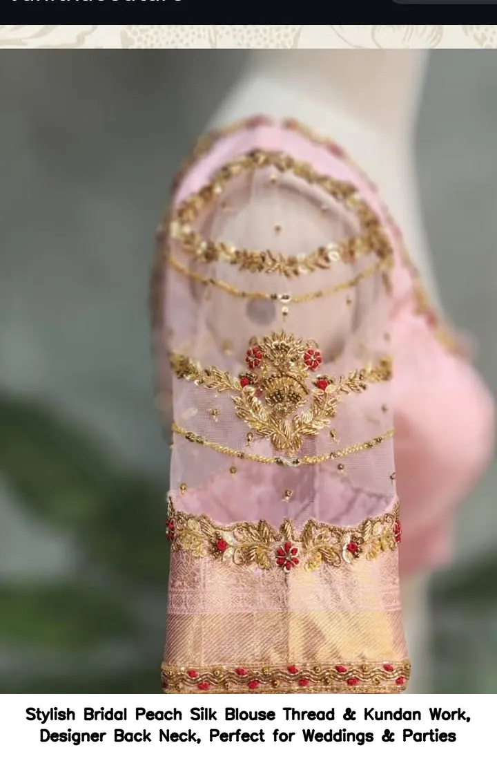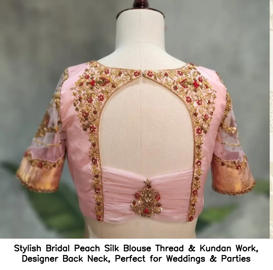 Stylish Bridal Peach Silk Blouse – Thread & Kundan Work, Designer Back Neck, Perfect for Weddings & Parties offers elegance and sophistication. This blouse features intricate thread and Kundan work, enhancing your bridal look. Furthermore, its designer back neck adds a touch of uniqueness. You will stand out at every wedding or party.