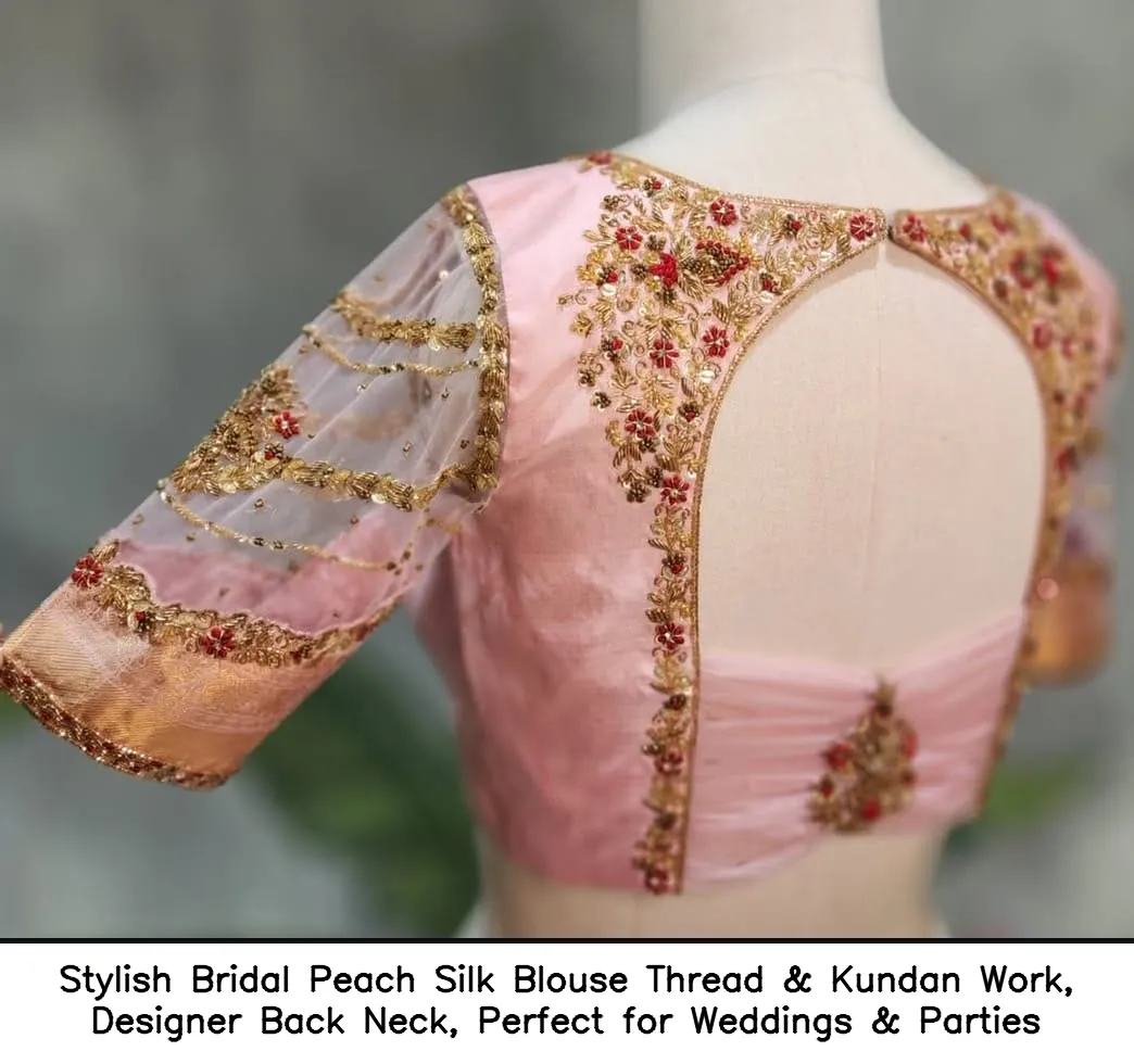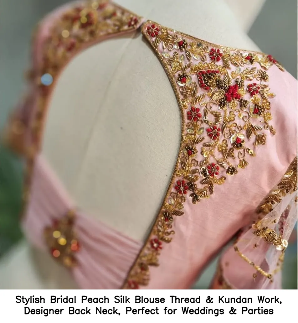 Stylish Bridal Peach Silk Blouse – Thread & Kundan Work, Designer Back Neck, Perfect for Weddings & Parties Features and Benefits