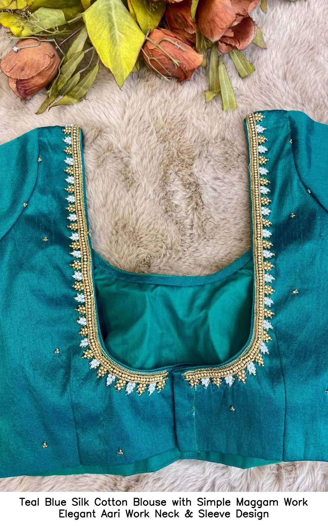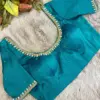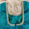 Product Name: ​​​​​Teal Blue Silk Cotton Blouse with Simple Maggam Work – Elegant Aari Work Neck & Sleeve Design