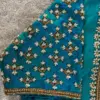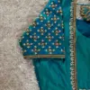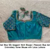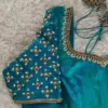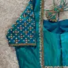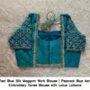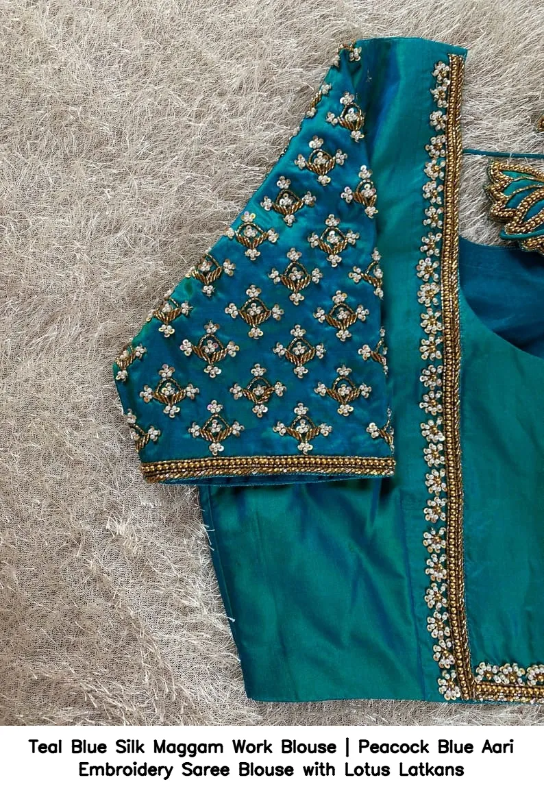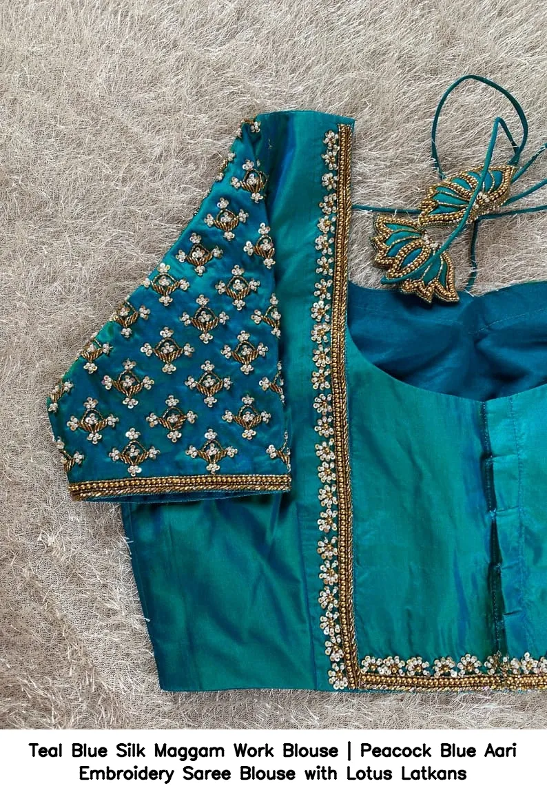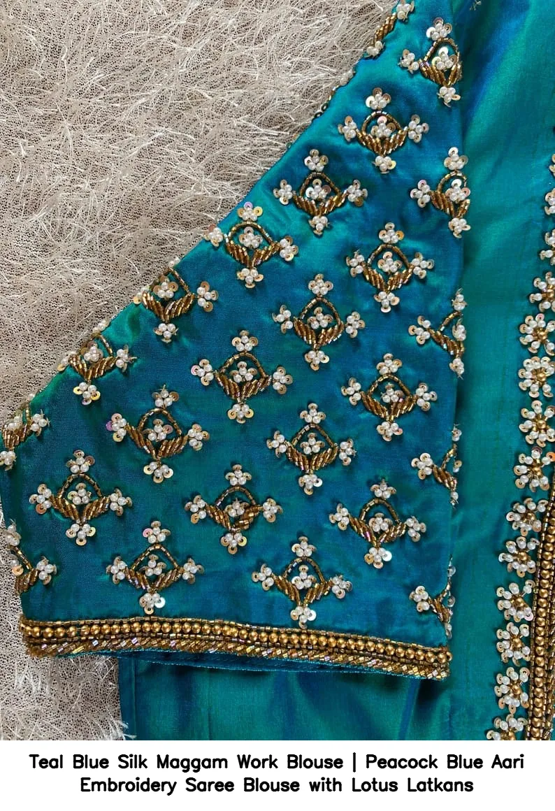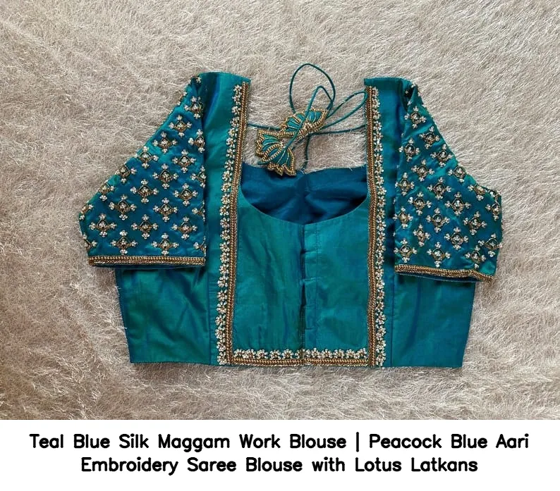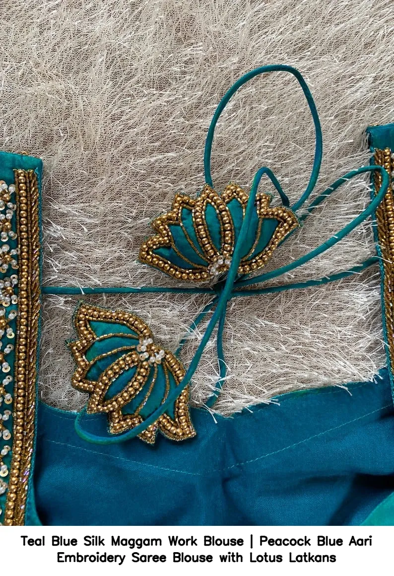 Product Name: ​​​​​​​Teal Blue Silk Maggam Work Blouse | Peacock Blue Aari Embroidery Saree Blouse with Lotus Latkans