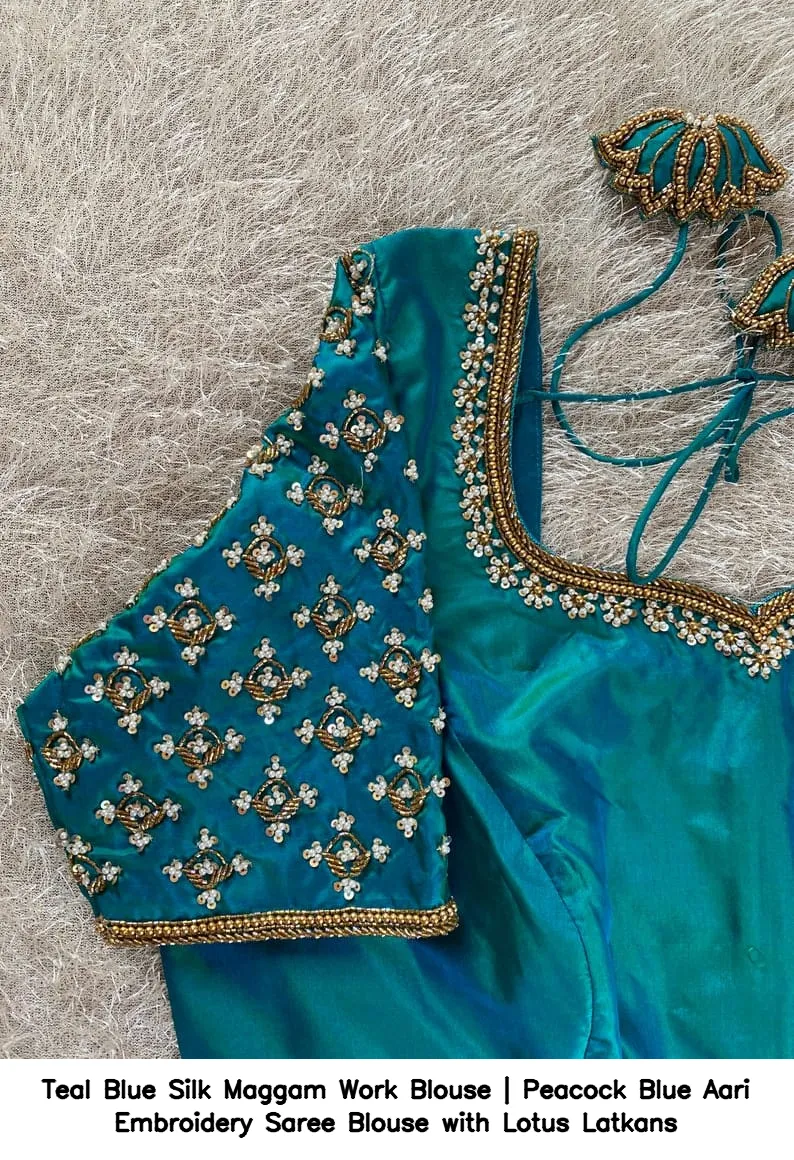 ​​​​​​​Teal Blue Silk Maggam Work Blouse | Peacock Blue Aari Embroidery Saree Blouse with Lotus Latkans