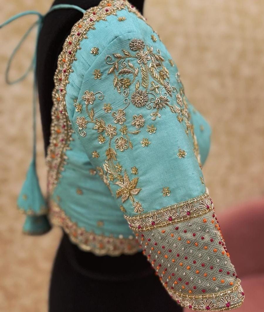 Hand-embroidered with Zardosi techniques, each detail reflects fine craftsmanship, adding an element of luxury to the blouse. - Custom Fit and Comfort