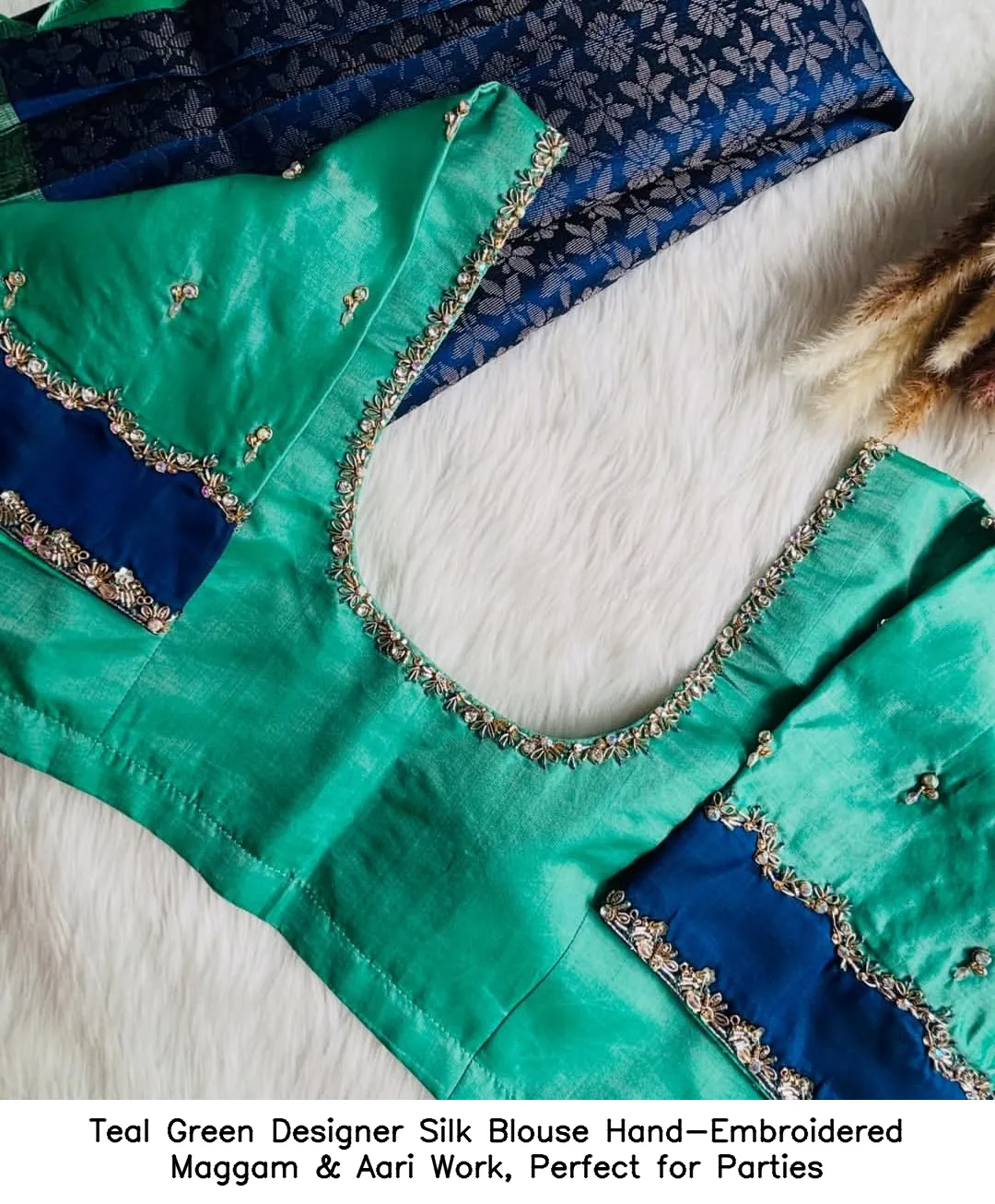 Why Choose Teal Green Designer Silk Blouse – Hand-Embroidered Maggam & Aari Work, Perfect for Parties?