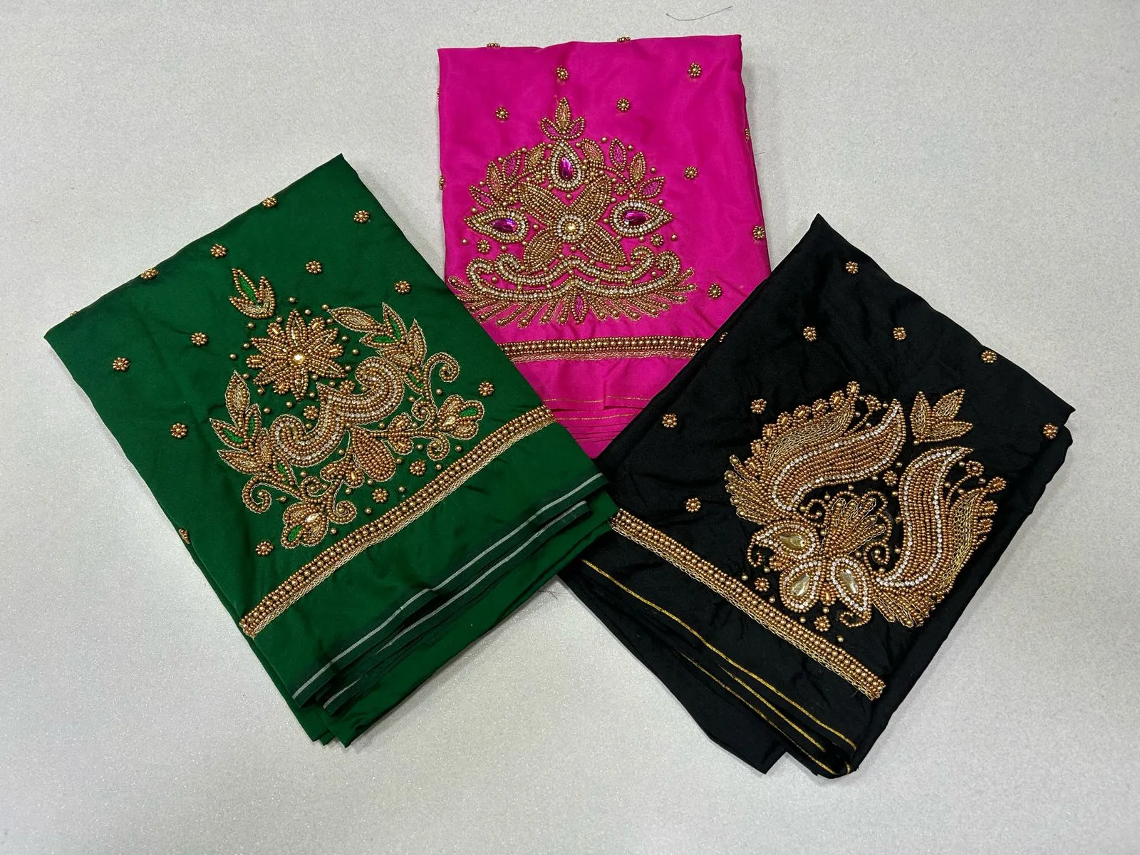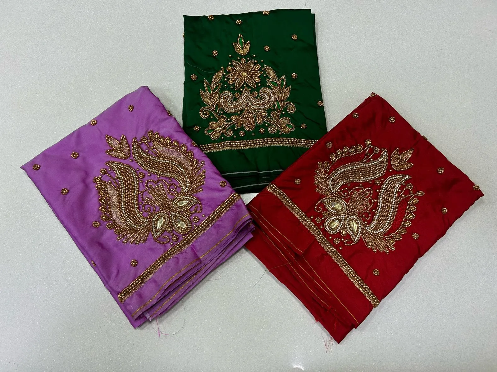This blouse is made from premium Raw Silk and Cotton Silk. It comes in sizes 32, 34, 36, 38, 40, 42, 44, and 46. Available colors include Blue, Black, Red, Green, Pink, Yellow, Lavender, and Gold. For more options, browse our collection.